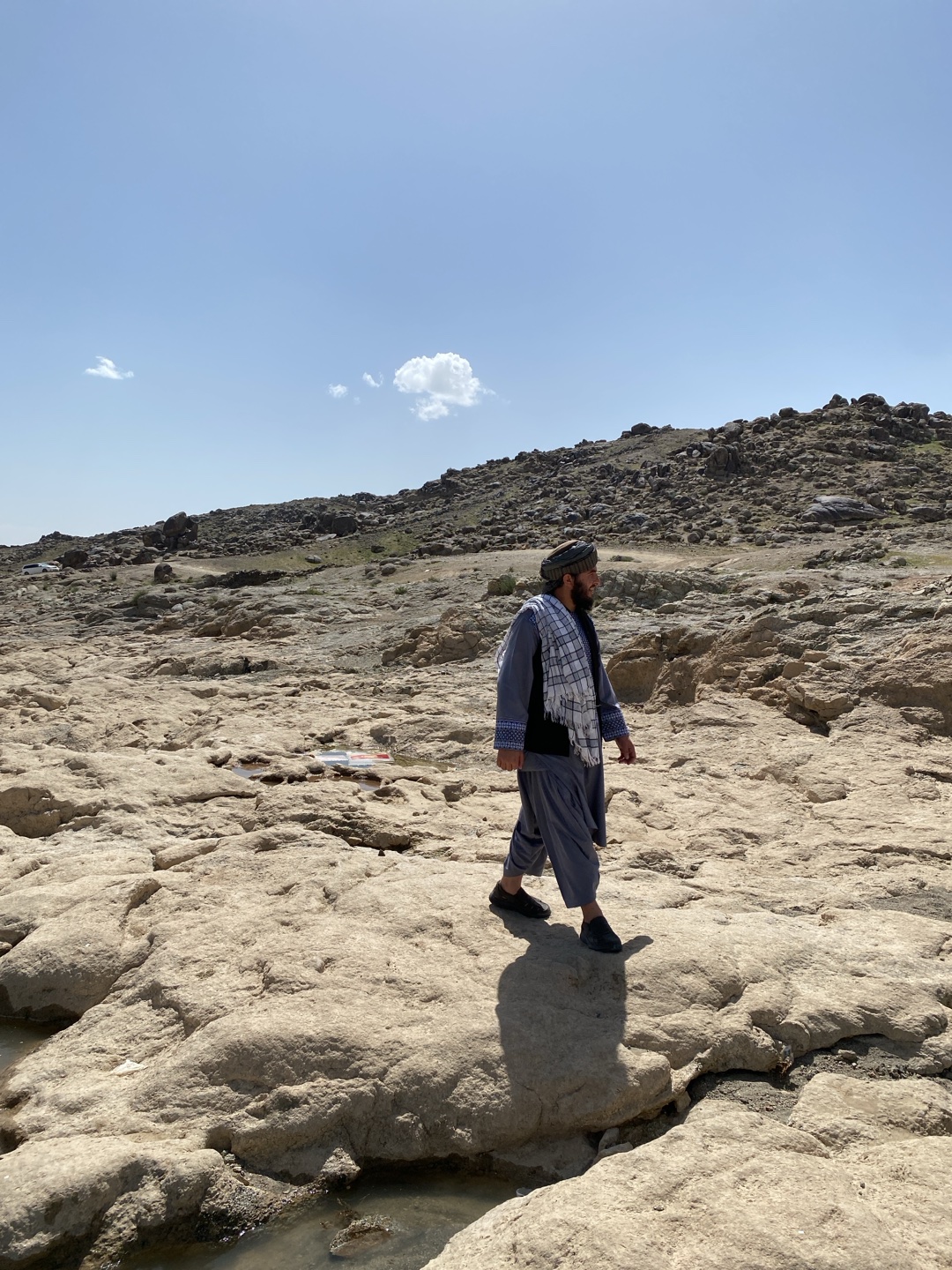 The photograph depicts a man walking across a rocky, arid landscape. The man is wearing traditional Afghan clothing, including a head wrap and loose-fitting pants. He also has a black vest and scarf w…read more