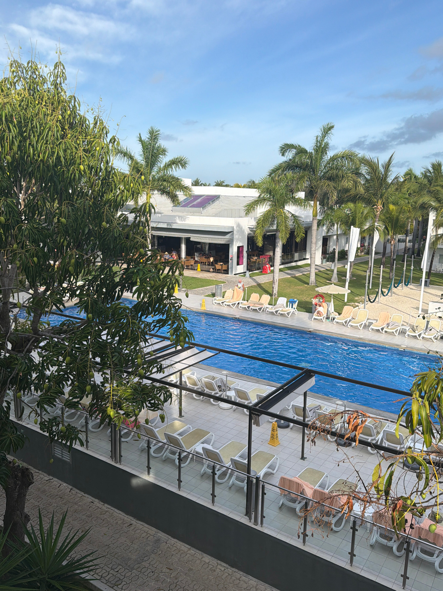 The image depicts an outdoor pool area at an apparent resort in Playa del Carmen, Mexico. A long, blue-tiled swimming pool is visible, surrounded by lounge chairs and palm trees. Some lounge chairs have towels on them, suggesting recent or current use. A multi-story white building is adjacent to the pool, likely part of the resort. The sky is blue with scattered clouds. A tree with green leaves and fruit is in the foreground. A black metal structure is on the right side of the pool. | Open Wire