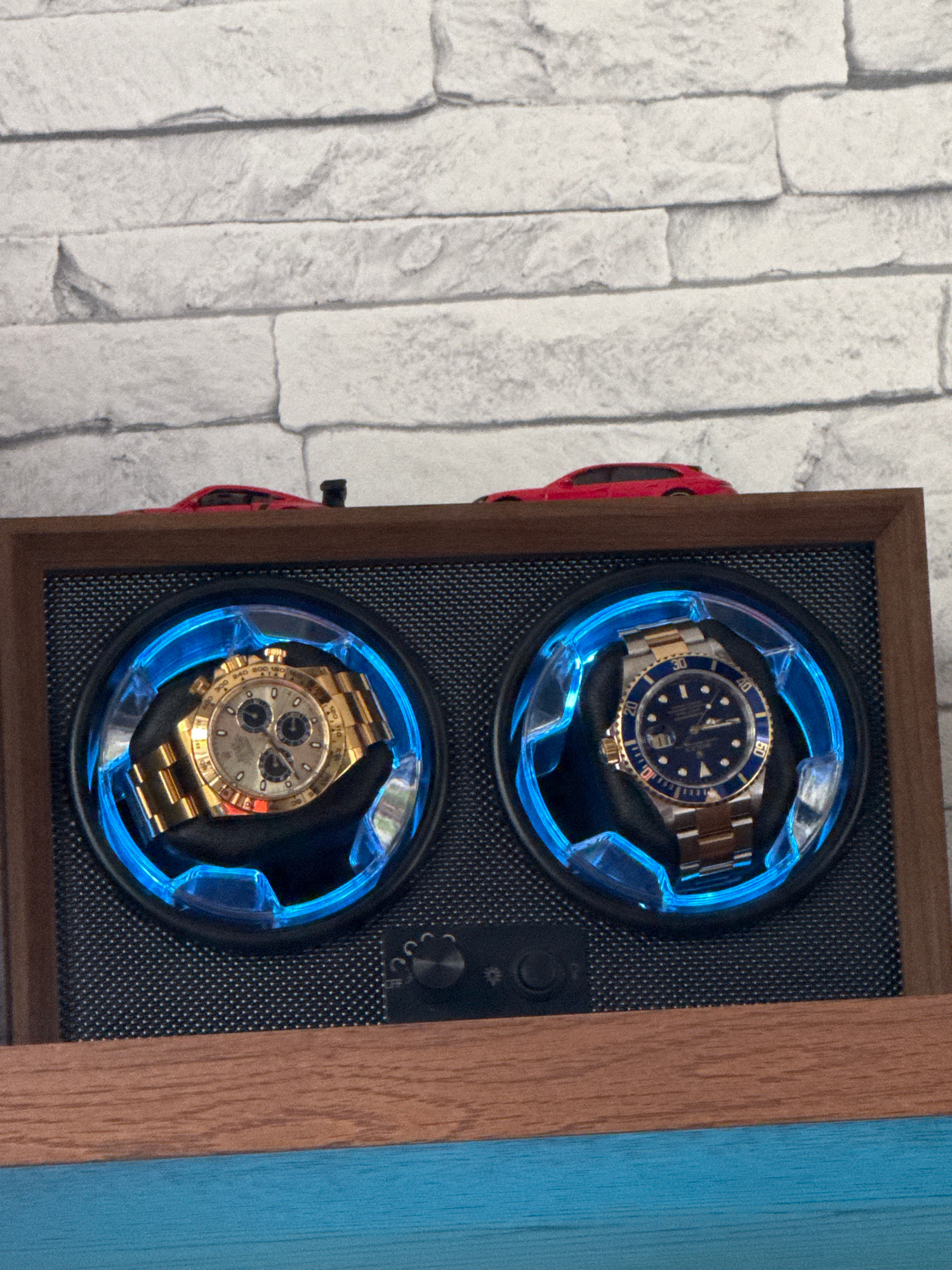 A watch winder is seen from a close-up perspective. The winder, enclosed in a dark wooden frame, contains two circular compartments illuminated with blue LED lights. Each compartment houses a luxury w…read more