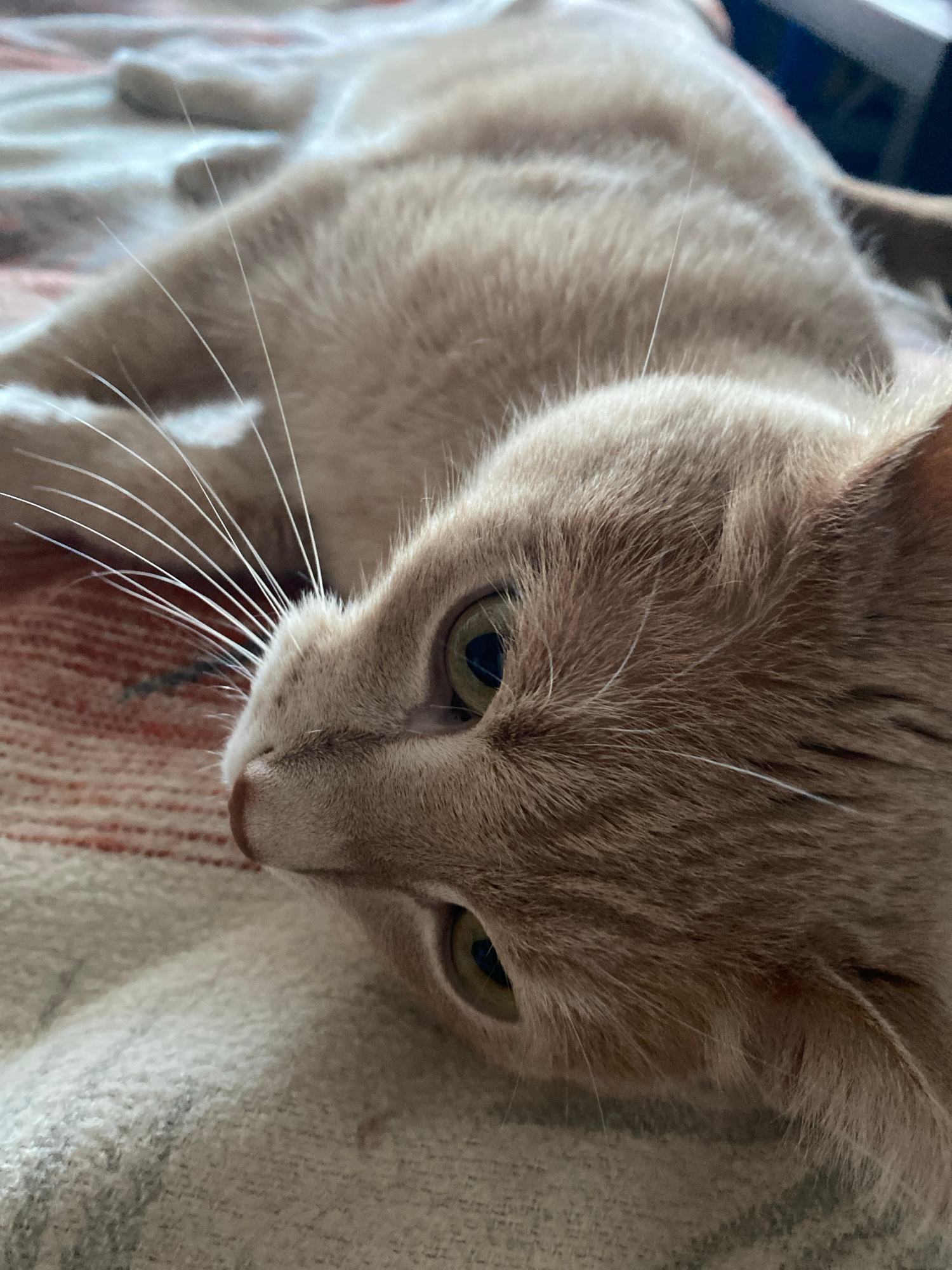 This close-up image features a domestic cat, likely an adult, in an indoor setting. The cat's fur is a light, warm taupe or cream color, exhibiting subtle tabby patterns, particularly on its head and…read more