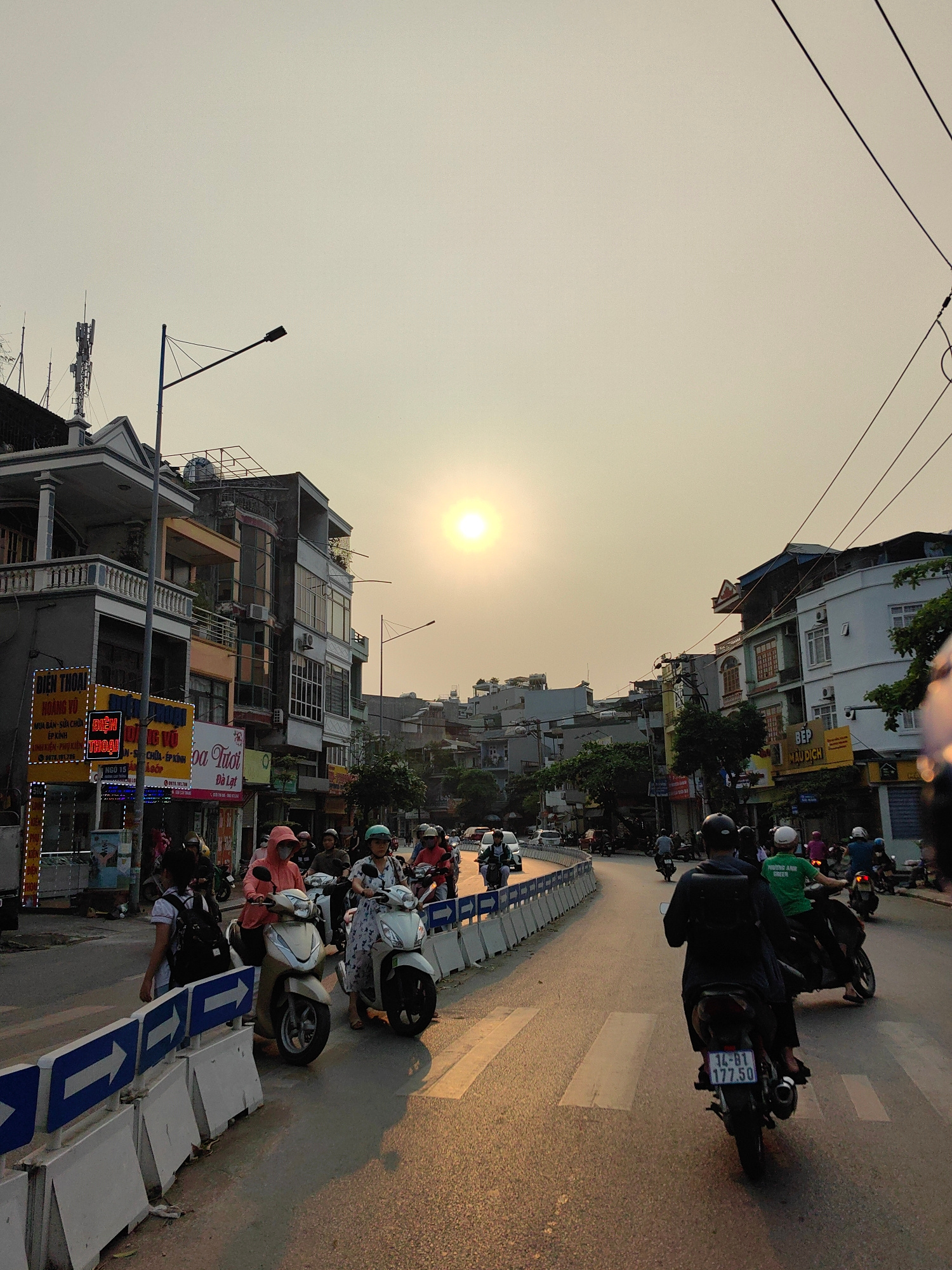 The image captures a street scene in Ha Lam Ward, Vietnam. The street is filled with various motorbikes, some parked and some in motion. People are visible on the motorbikes and walking along the stre…read more