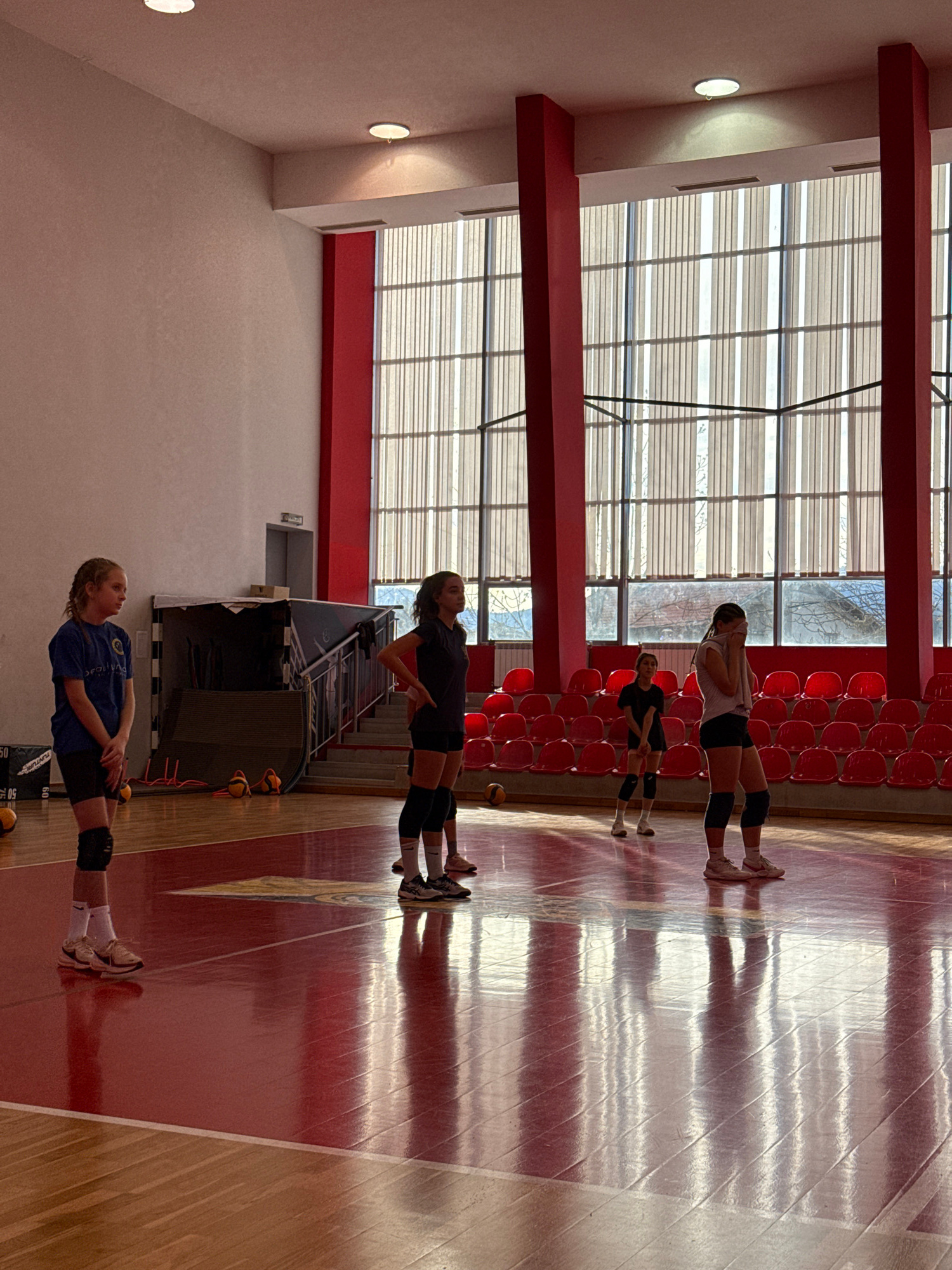 Several female athletes are performing warm-up exercises in an indoor sports hall. The hall features a wooden floor with red markings, red seating in the background, and a large windowed wall allowing…read more