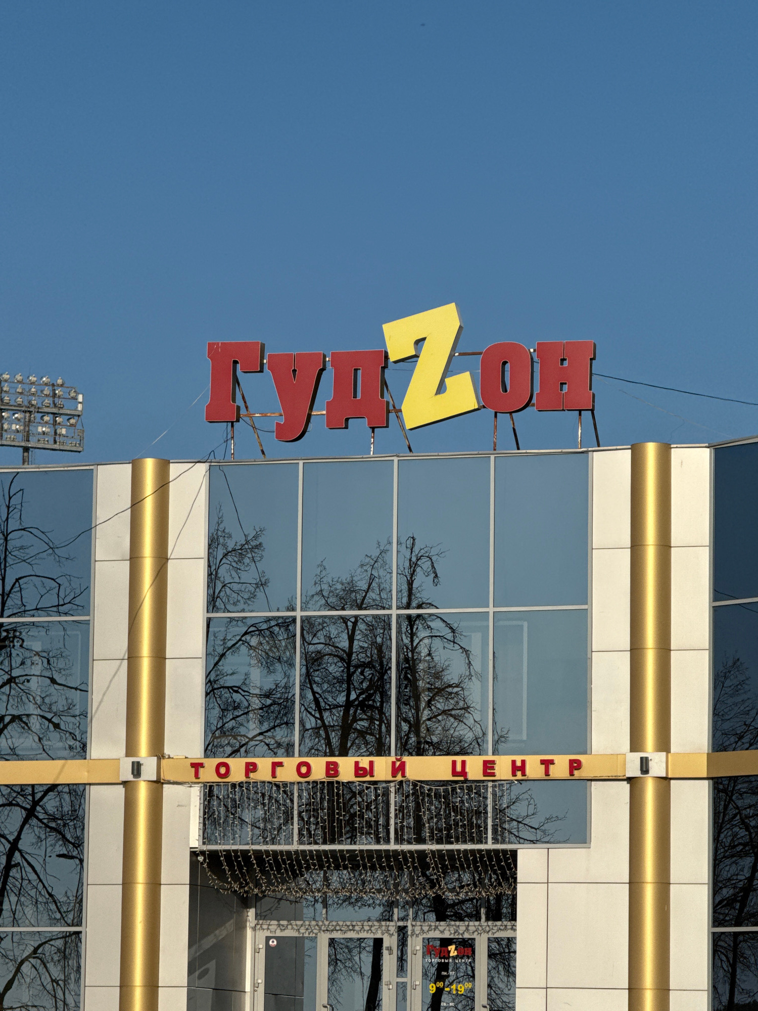 A building with a sign is shown against a blue sky. The sign reads "ГУМЗОН" in red and yellow letters vertically, next to a modern building that appears to be a shopping center. Another sign, oriented…read more