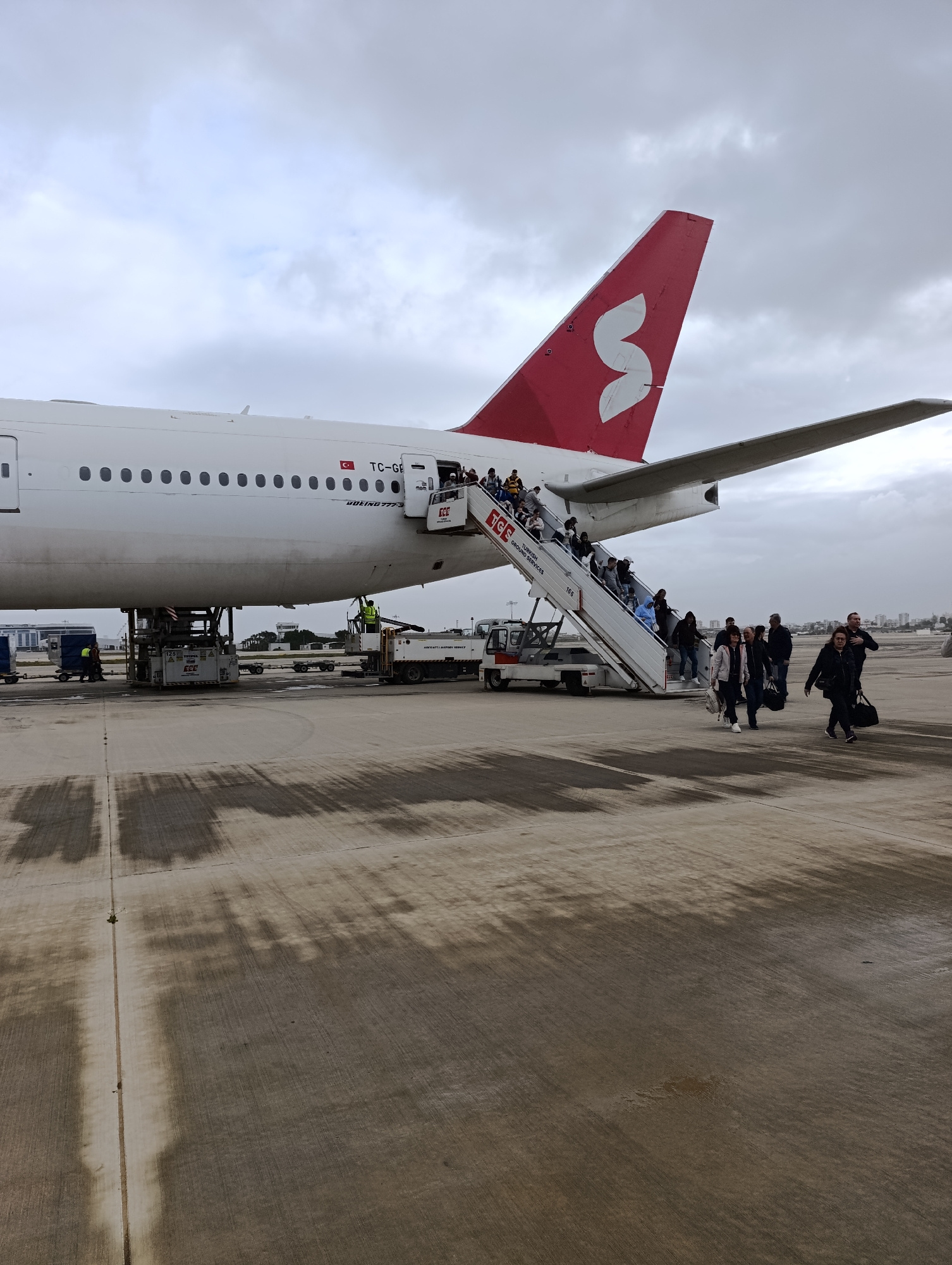 The image shows an aircraft at Antalya Airport in Turkey. People are exiting the aircraft via a mobile stairway. The plane is white with a red tail fin displaying a white stylized "S" logo. Turkish fl…read more