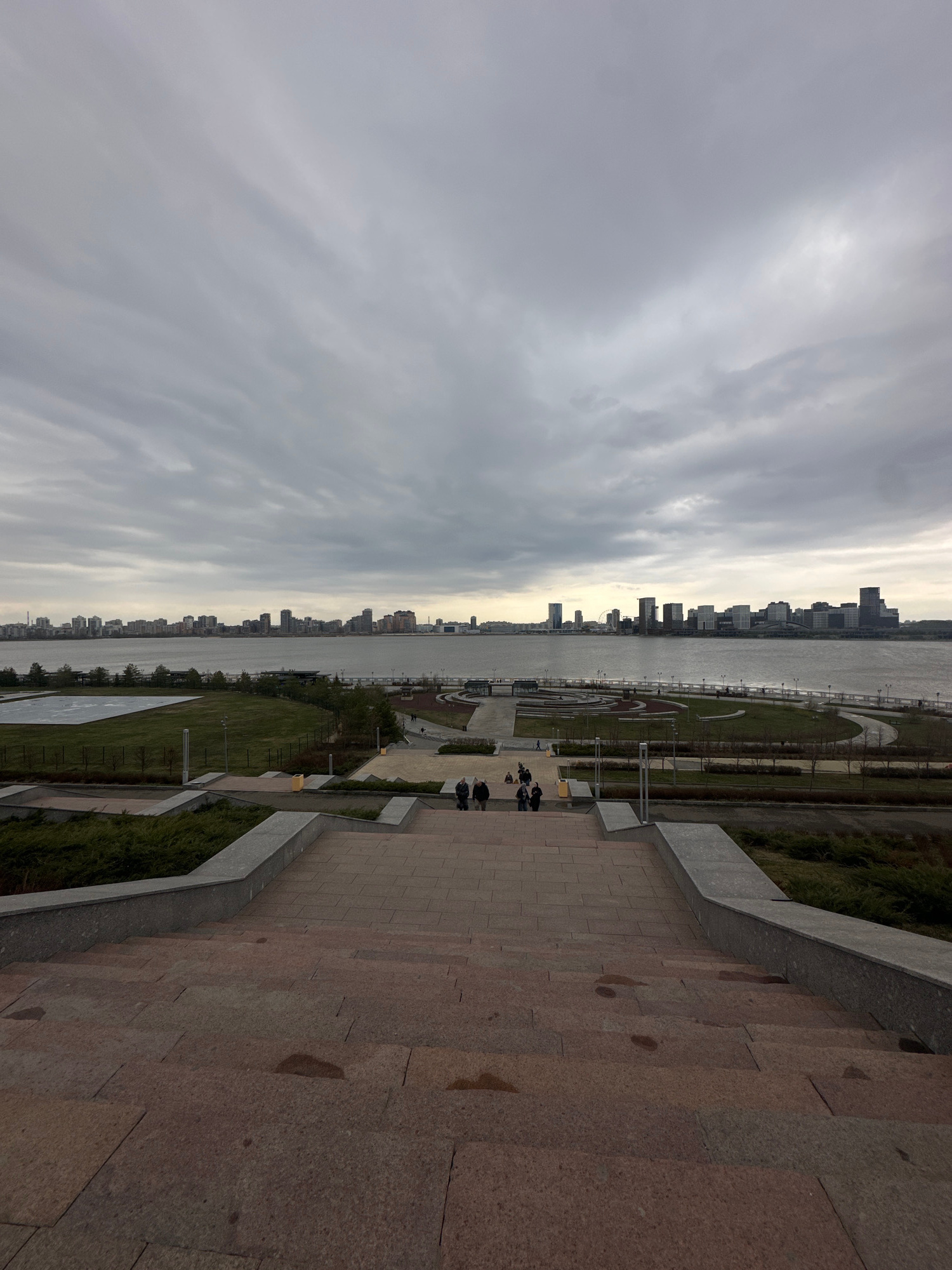 View from a high vantage point in Kazan, Russia, overlooking the waterfront. The camera is positioned on a paved terrace with concrete railings. Below, there is a well-maintained green space with path…read more