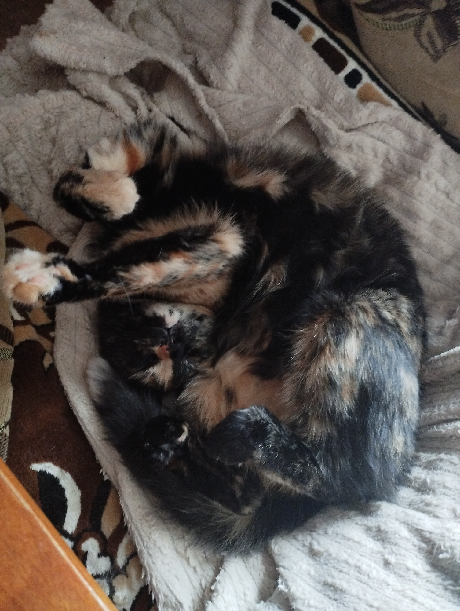 A calico cat is curled up asleep on a gray, textured blanket. The cat is mostly black with patches of orange and white, and it's positioned in the center of the frame. The blanket is lying on top of p…read more