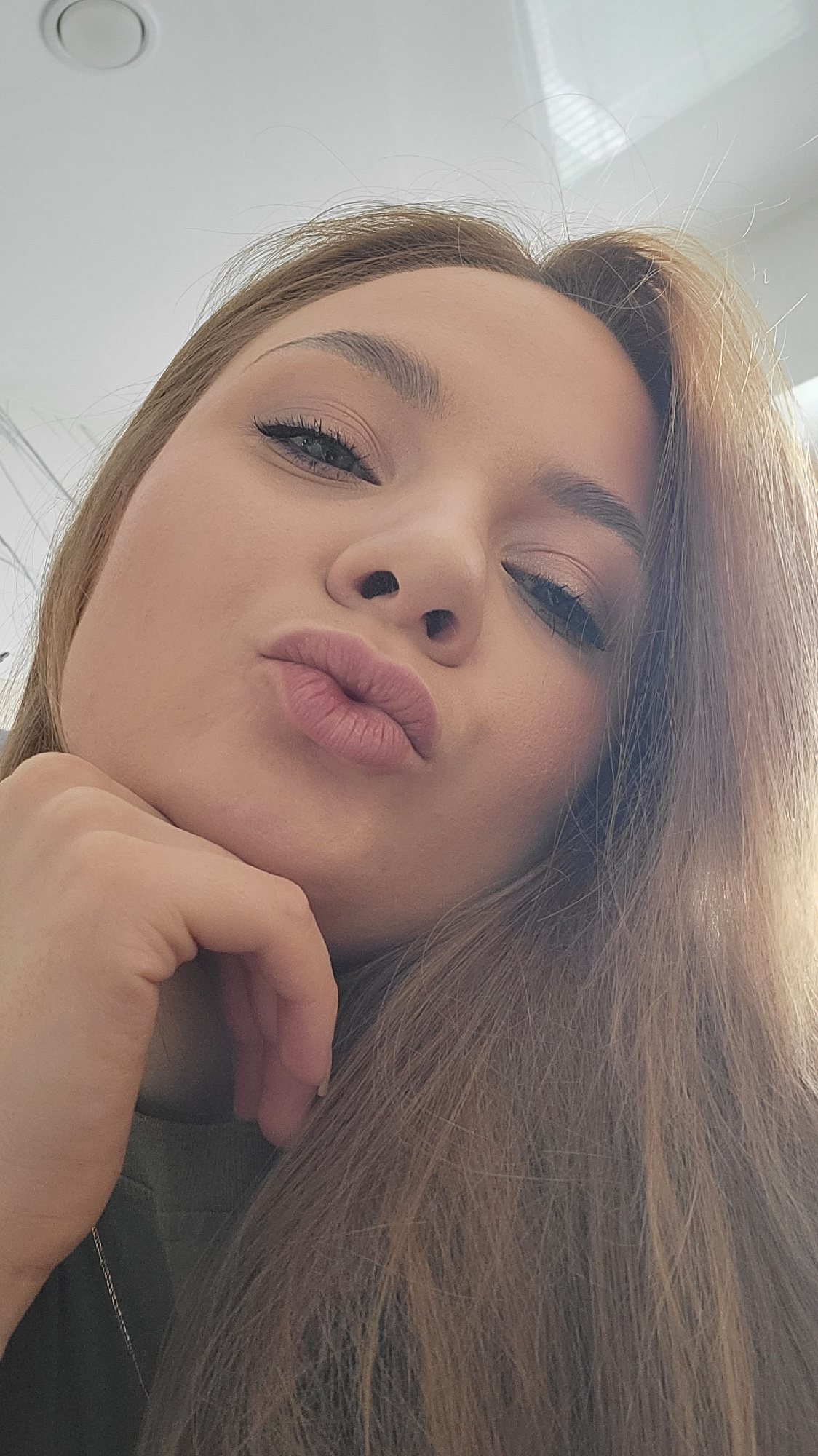 The image shows a woman with long, light brown hair, wearing makeup, including eyeshadow and mascara, making a kissing face towards the camera. She is resting her chin on her hand. A small part of wha…read more