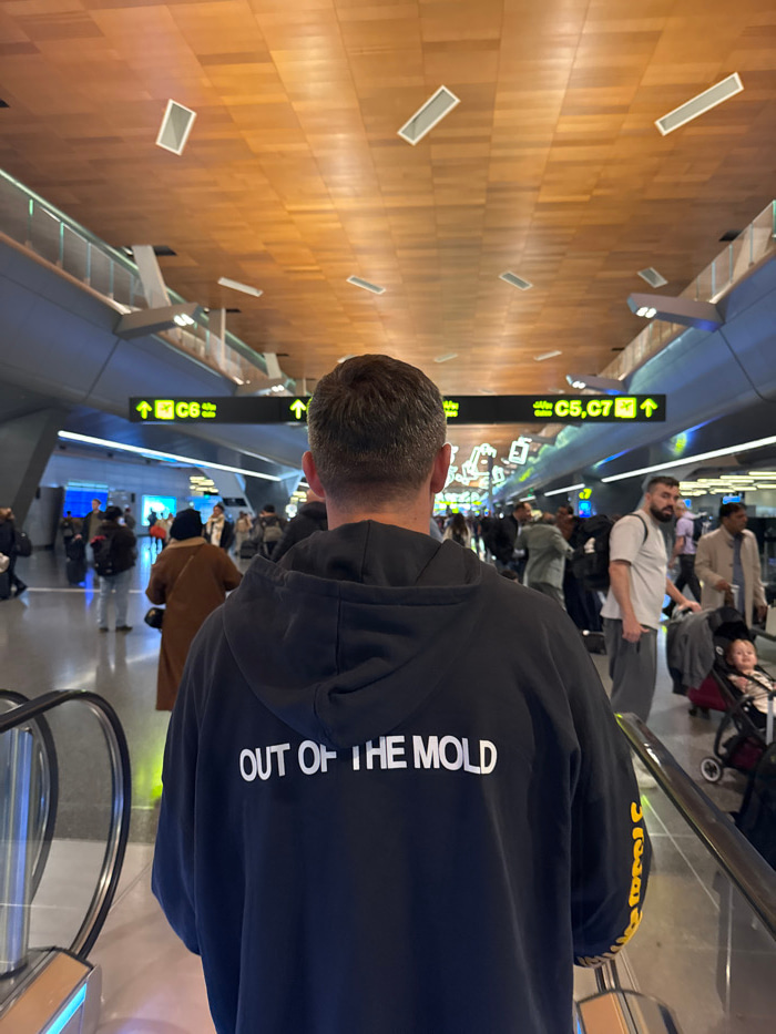 An individual, wearing a navy hooded sweatshirt with "OUT OF THE MOLD" printed in white on the back, stands on a moving walkway. The location appears to be an airport terminal, evidenced by directiona…read more