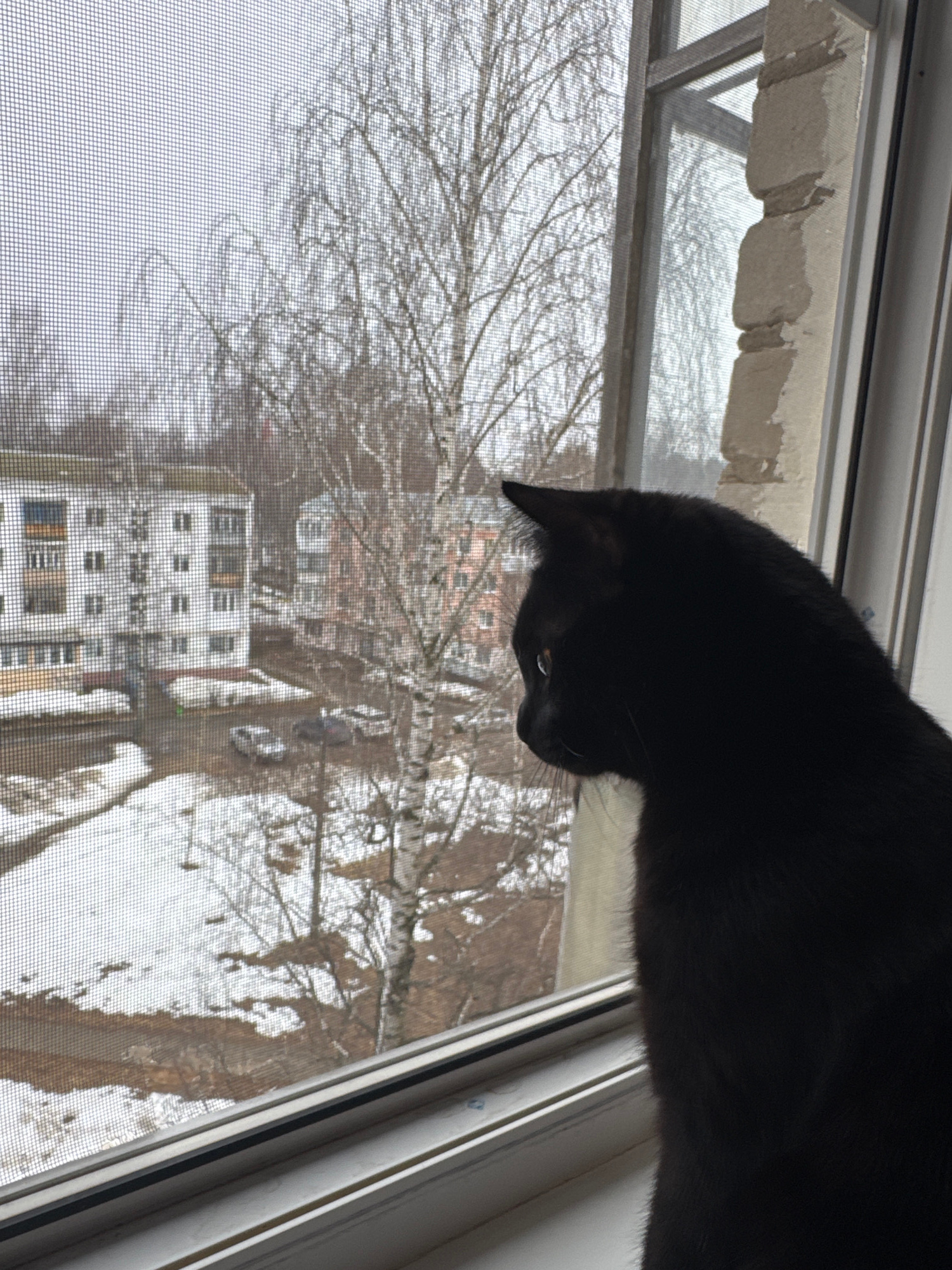 A black cat perches on a windowsill, gazing down at a snowy urban scene. Outside the window screen, bare trees frame a view of apartment buildings in what appears to be Chaikovsky, Russia. Snow coversβ¦read more