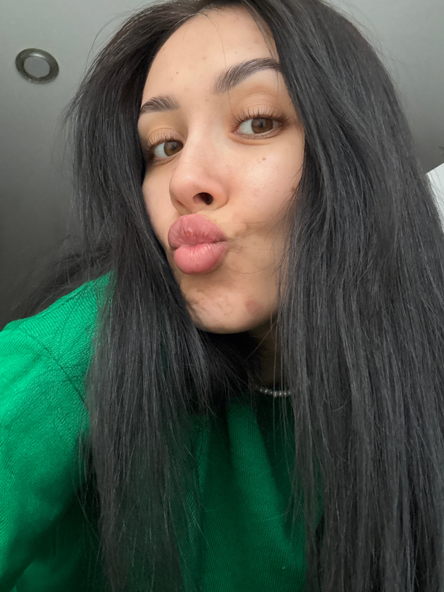 A young woman with dark hair and brown eyes is angled in the frame. She is wearing a green sweater, and making a kissing face. There is a light-colored wall visible in the background. The location is…read more