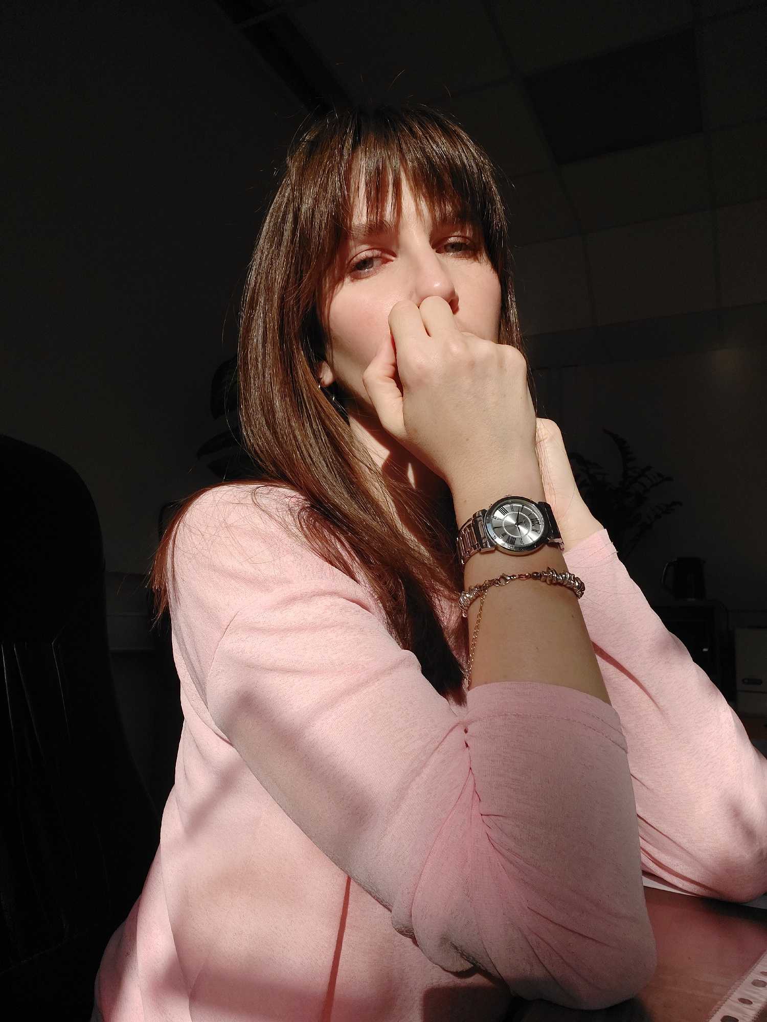 The image presents a close-up, angled portrait of a person, likely female, with long, straight dark brown hair and light-colored eyes. She is wearing a light pink long-sleeved top. Her head is tilted,…read more
