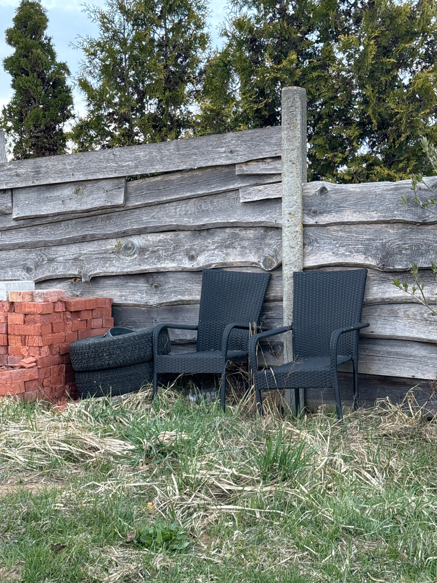 The image displays an outdoor scene in Самахвалавіцкі сельскі Савет, Belarus, featuring a weathered wooden fence with various items stored against it. The fence, constructed from rough, greyed timber…read more