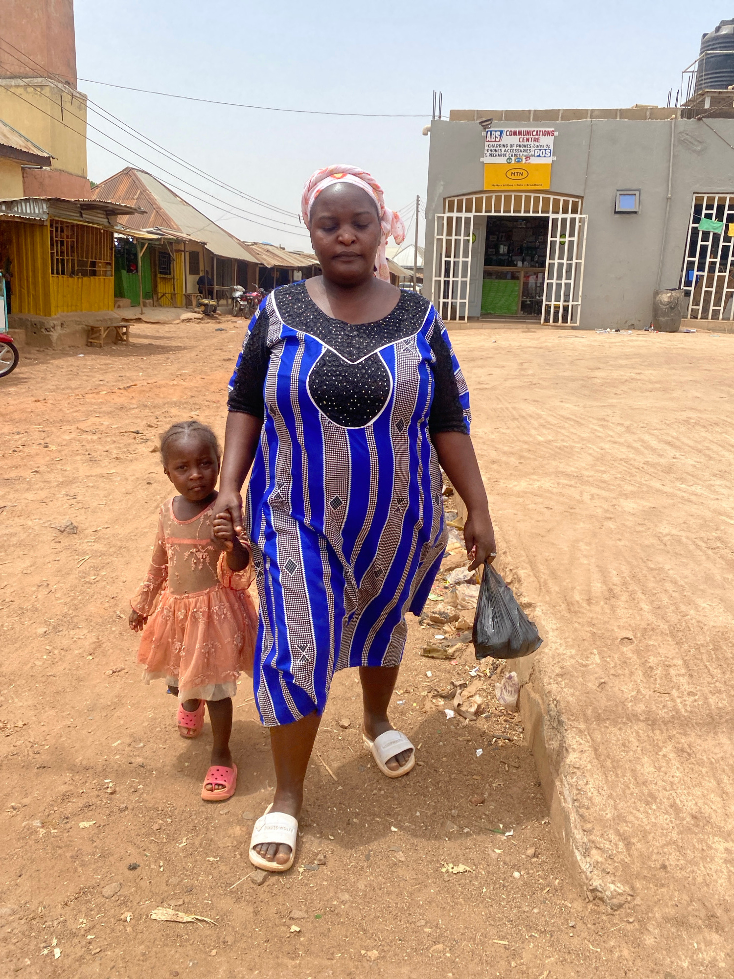 An outdoor scene in Rido, Nigeria, depicts an adult female and a young child walking forward on a reddish-brown dirt path. The adult female, wearing a light-colored patterned headscarf, a blue and bla…read more