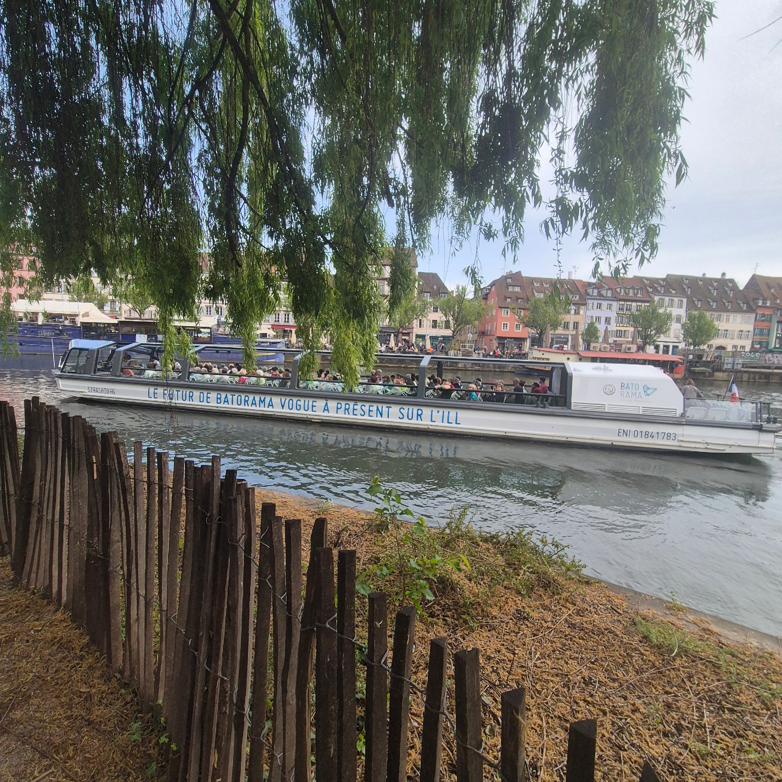 The image captures a boat tour, likely of the Batorama company, cruising along the Ill River in Strasbourg, France. The boat is filled with passengers, suggesting a popular attraction. The river is bo…read more