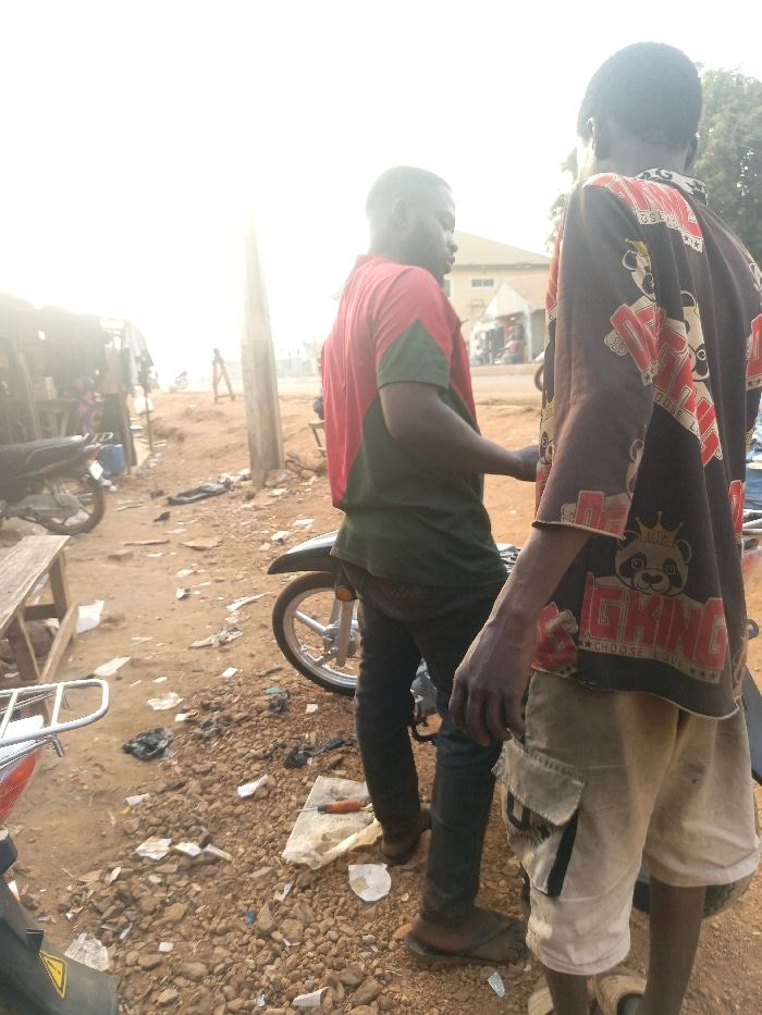 Two people stand beside a motorbike in a dusty, litter-strewn environment. One wears a red and green shirt with dark pants and sandals, while the other sports a panda-printed shirt and light-colored s…read more