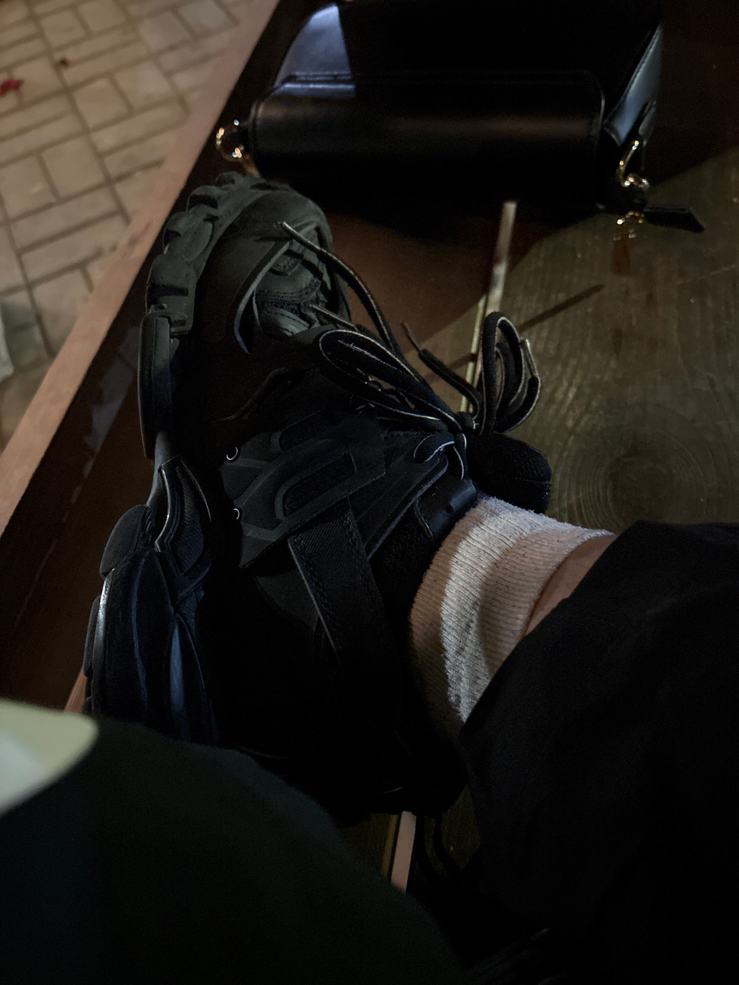 A close-up shot captures a dark athletic shoe on a wooden surface, likely indoors. The shoe is primarily black, with visible laces and a thick sole. A white sock is visible above the shoe's opening. T…read more