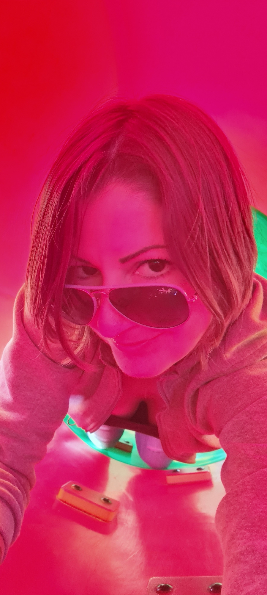 A person with reddish-brown hair is visible, wearing heart-shaped sunglasses. They appear to be inside a playground tunnel or slide, indicated by the pink and green plastic surfaces surrounding them.…read more