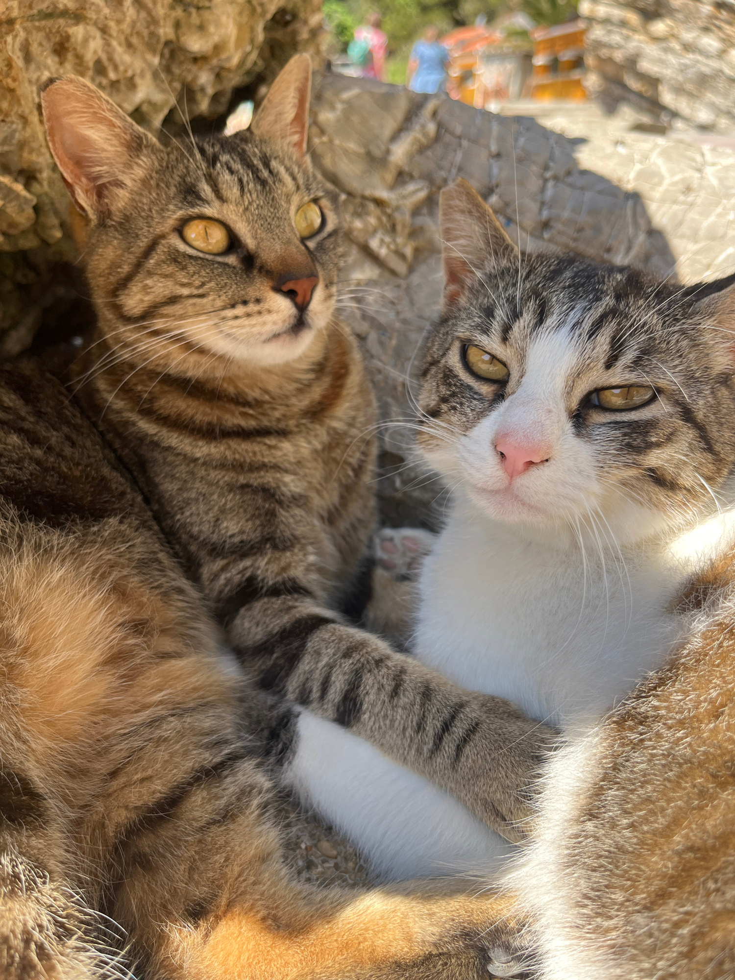 Two cats are lying on a concrete surface, likely outdoors. The cat at the top of the frame has a white face with grey and brown tabby markings and a pink nose. Its paw rests on the body of the cat bel…read more