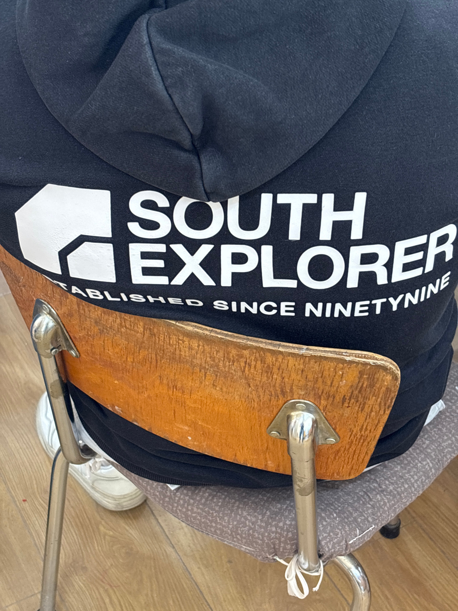 A photograph taken at a high angle shows a black hooded sweatshirt with white lettering reading "SOUTH EXPLORER" and "ESTABLISHED SINCE NINETYNINE." The sweatshirt is draped over an old wooden school…read more