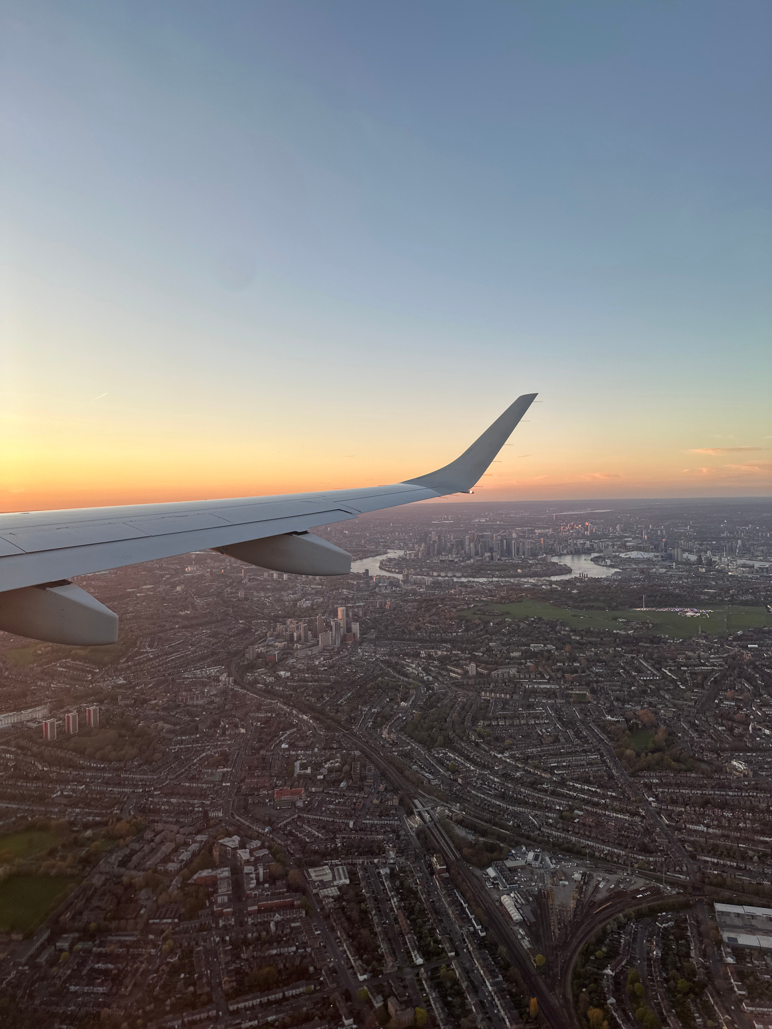 The image depicts an aerial view of London, United Kingdom, taken from an airplane. The left side of the image shows the wing of the plane against a gradient sky transitioning from blue to orange, sug…read more