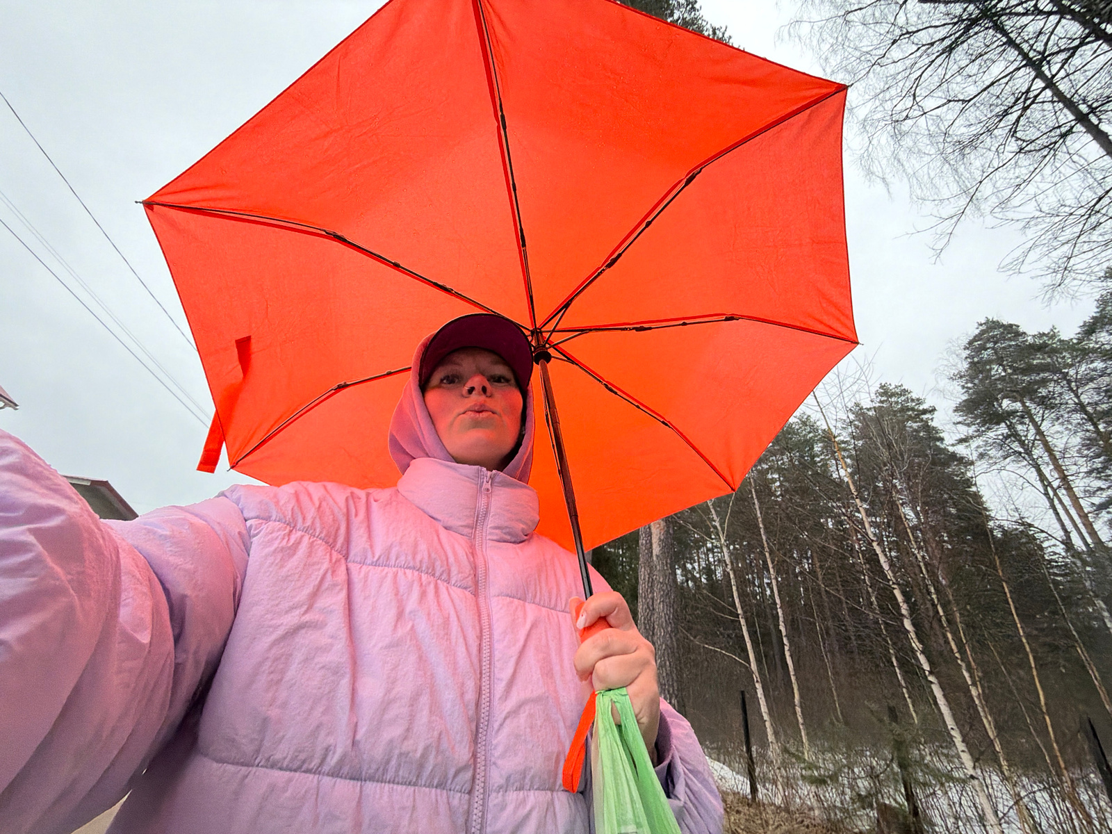 A person wearing a light purple puffer jacket and hood is holding an open orange umbrella. The photo is taken from a low angle, looking up. The background shows bare trees and a cloudy sky. The locatiβ¦read more