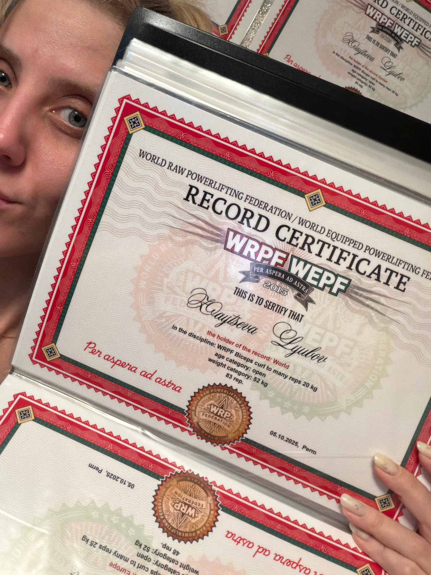 A close-up, angled shot captures a woman partially obscured by several powerlifting record certificates displayed in a holder. The certificates, from the "WORLD RAW POWERLIFTING FEDERATION / WORLD EQU…read more
