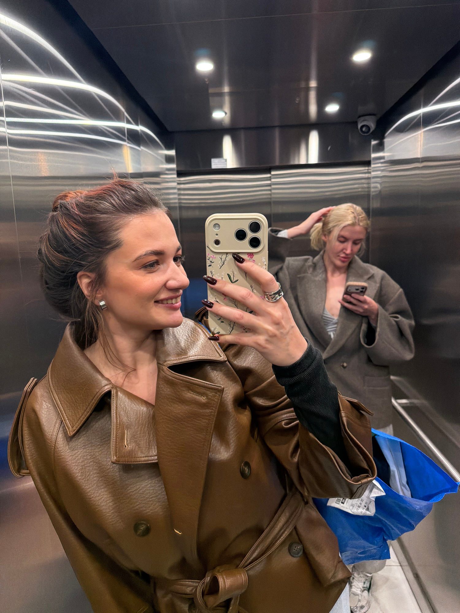 Two females are depicted inside a modern elevator with brushed metal walls and a dark ceiling featuring recessed lighting. The scene is located in Belgrade, Serbia. In the foreground, a female with li…read more