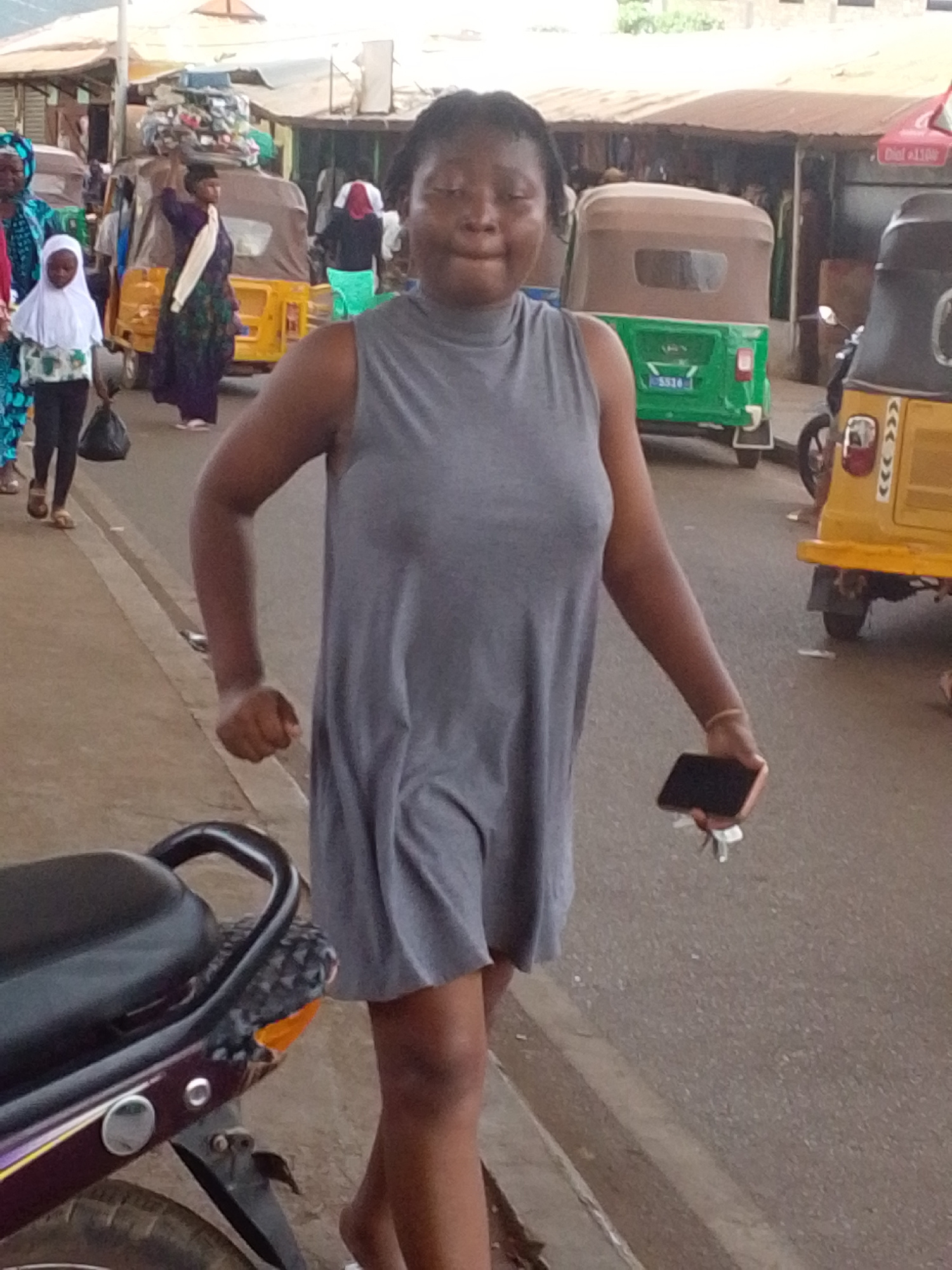 The image depicts a woman walking in a street in what appears to be Tamale, Ghana, based on the visible auto rickshaws commonly used for transportation. She is wearing a gray, sleeveless dress and hol…read more