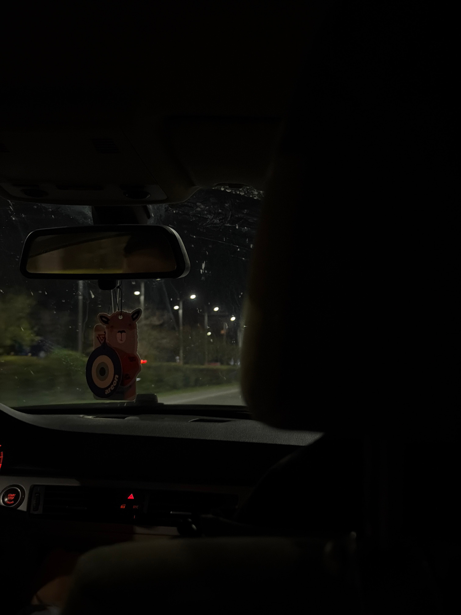 The image captures the interior of a car at night, viewed from what appears to be the driver's perspective, looking through the windshield. The scene is predominantly dark, contrasting with the bright…read more