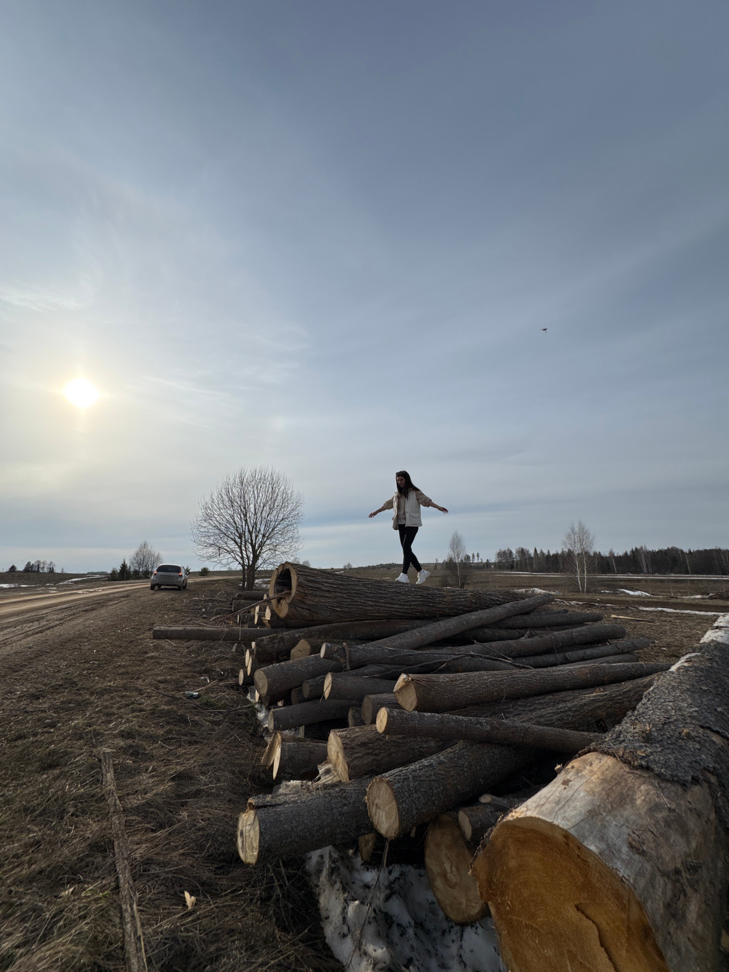 A person is standing on a stack of logs in a rural environment. The person, wearing dark pants and a light-colored jacket, has their arms outstretched. The logs are piled high on the right side of theβ¦read more