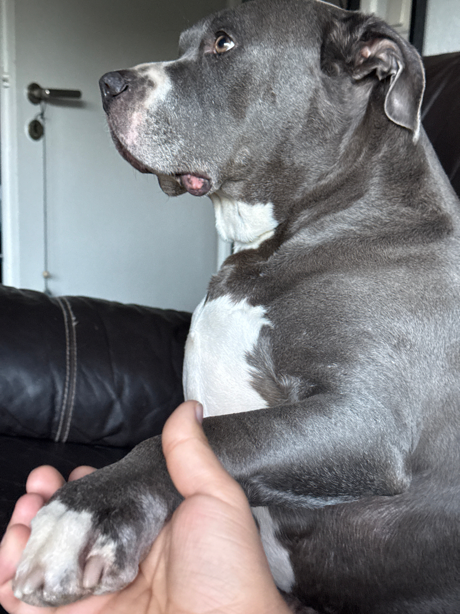 The image presents a close-up, portrait-oriented view of a dog being held indoors, likely in a home in Esch-sur-Alzette, Luxembourg. The main subject is a medium-sized dog, possibly a Staffordshire Bu…read more