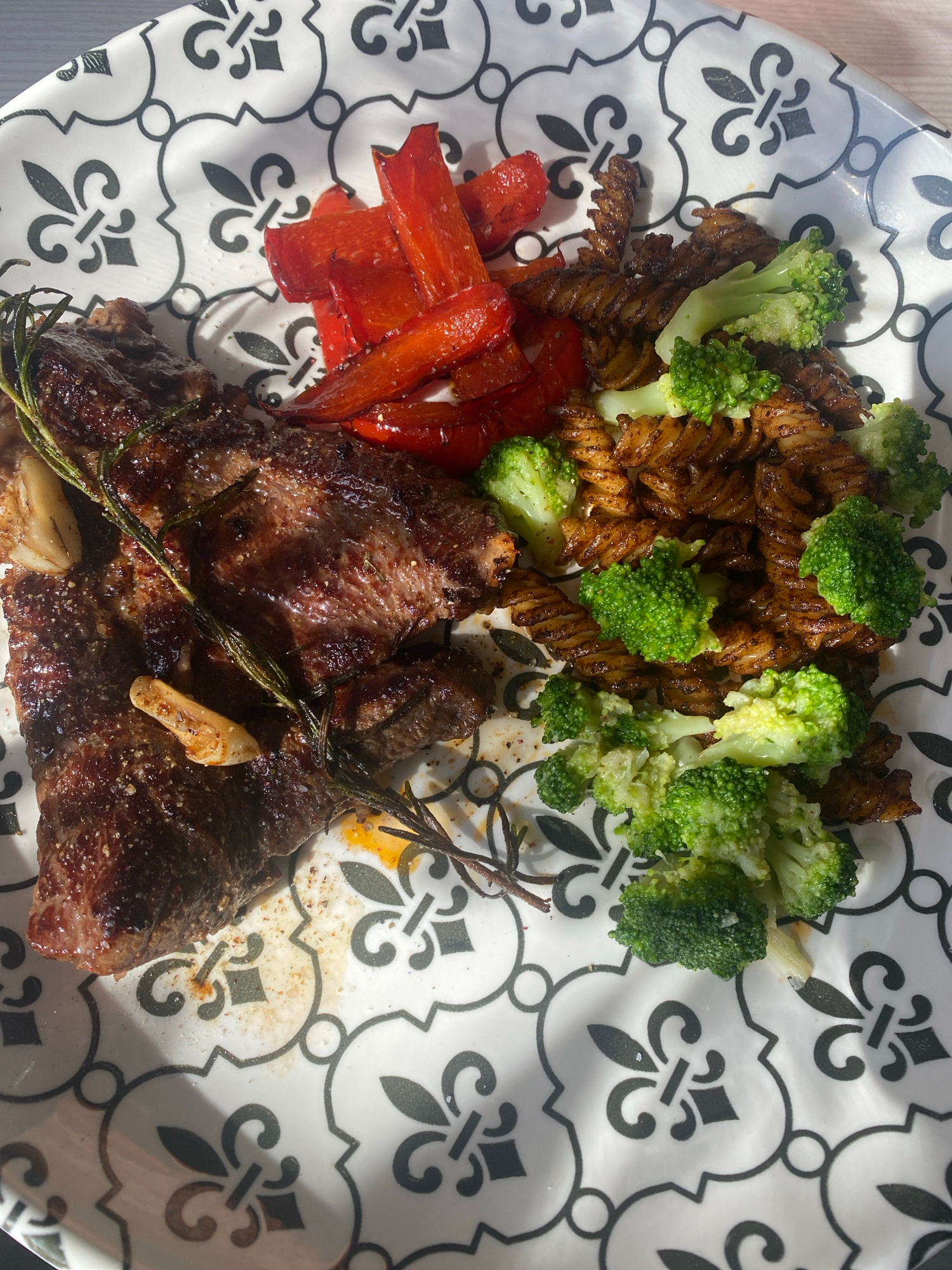 This media file displays a close-up, overhead view of a plated meal. The primary subject is a serving of food arranged on a white plate with a black and gray decorative pattern. The meal consists of…read more