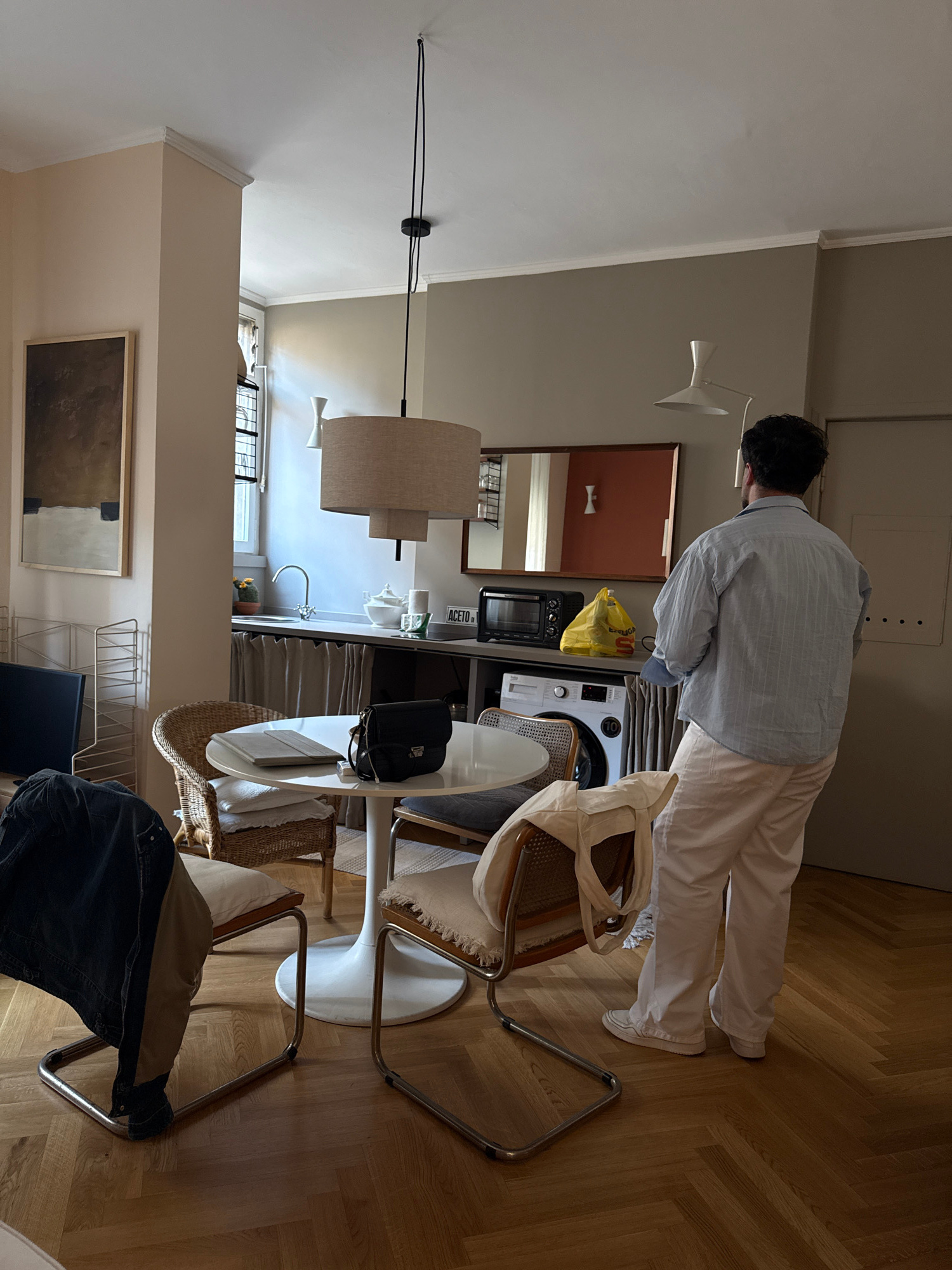 A medium-shot photograph taken from a slightly elevated perspective captures the interior of what appears to be an apartment or a modern home. The individual standing, likely a resident or guest, has…read more