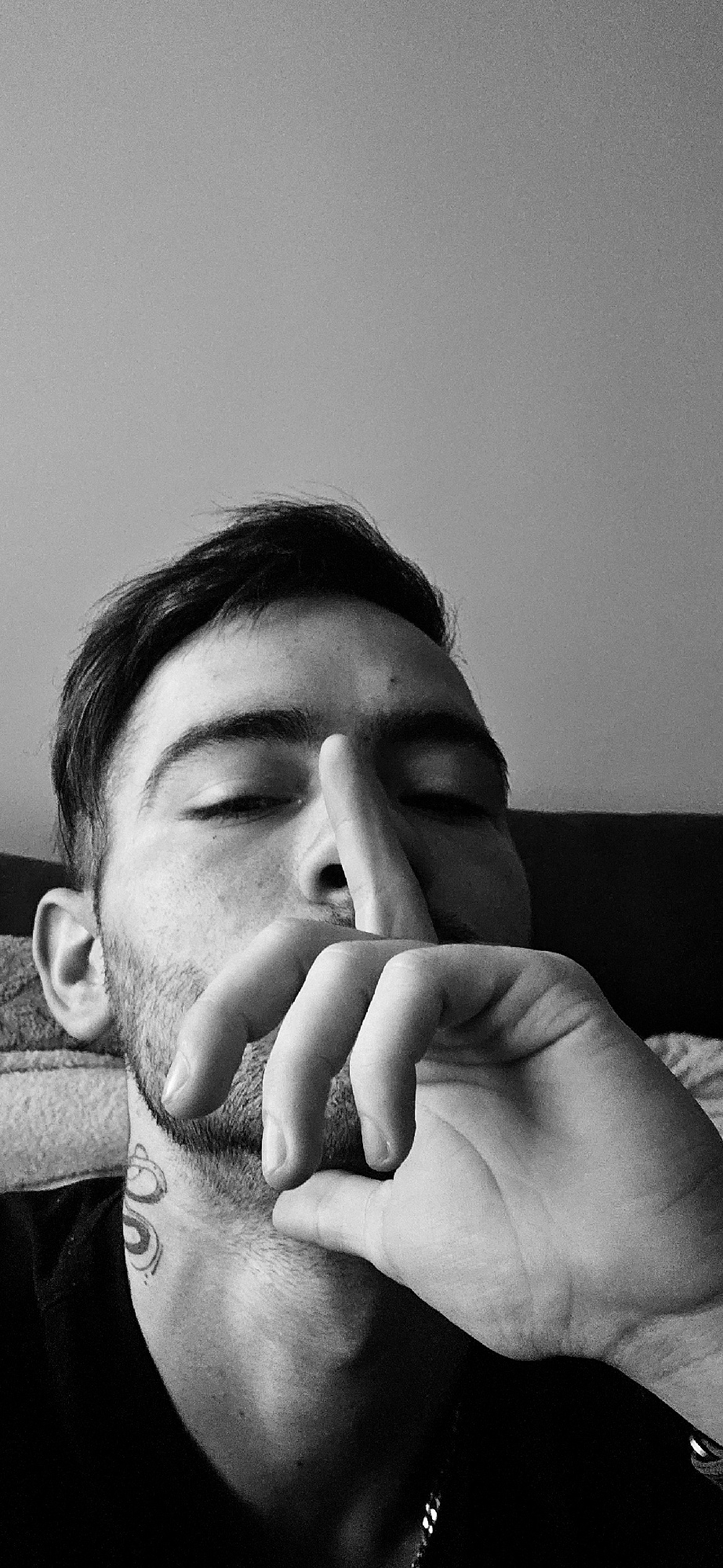 A black and white, close-up, and angled portrait features a person, likely male, from the chest up. The subject's head is tilted, with their eyes closed and a hand covering their mouth and nose. Theyβ¦read more