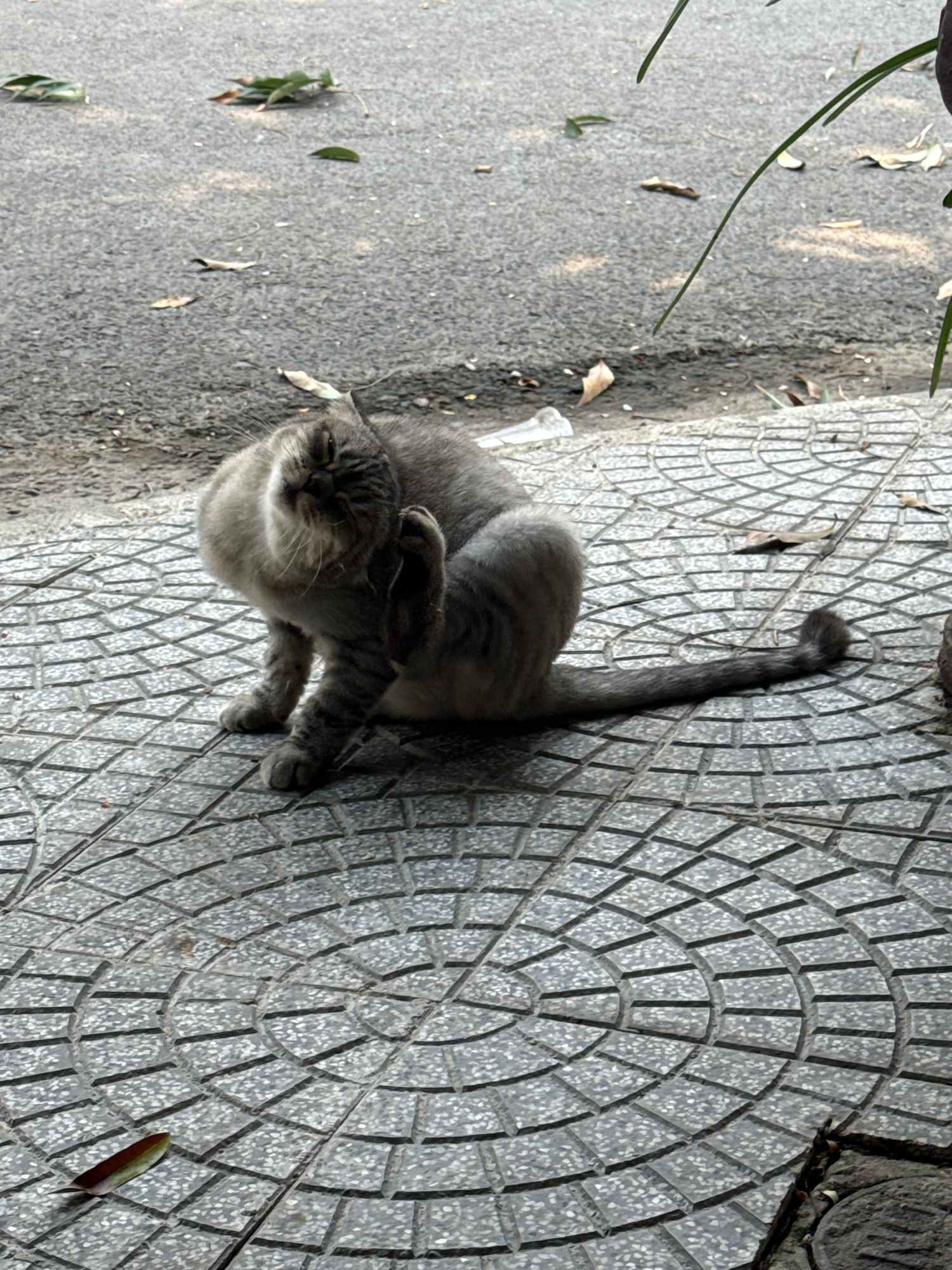 A gray tabby cat sits on a gray tile sidewalk with a circular pattern. The cat is facing forward and scratching its head. The sidewalk abuts a gray asphalt road. Some green plants are present at the e…read more