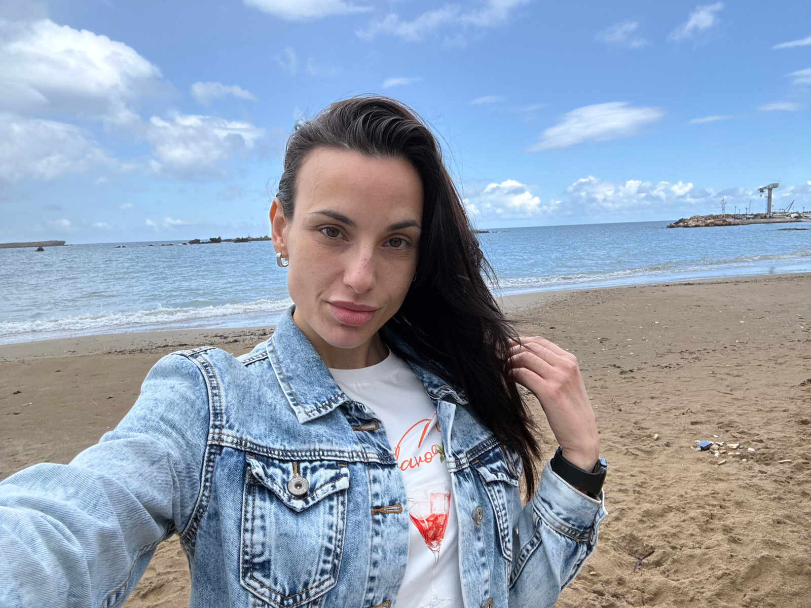 A person is holding a phone camera to take a selfie. The individual has dark hair and brown eyes, wearing a blue denim jacket over a white t-shirt with red graphics. The location appears to be outdoor…read more