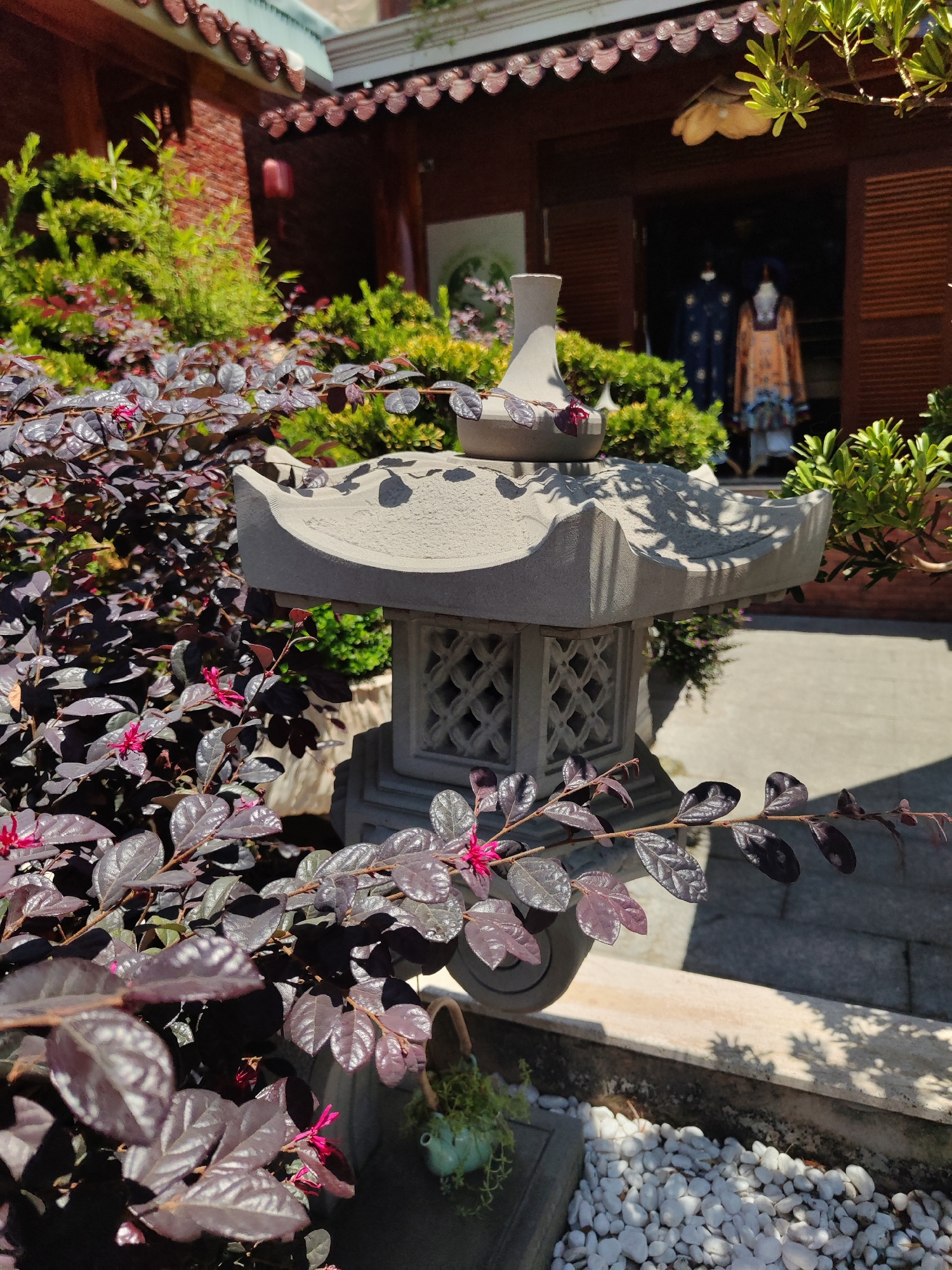 The image shows a Japanese-style stone lantern in a garden setting. The lantern is gray, with a multi-tiered roof and lattice-like openings. A plant with dark purple leaves and small pink flowers is p…read more