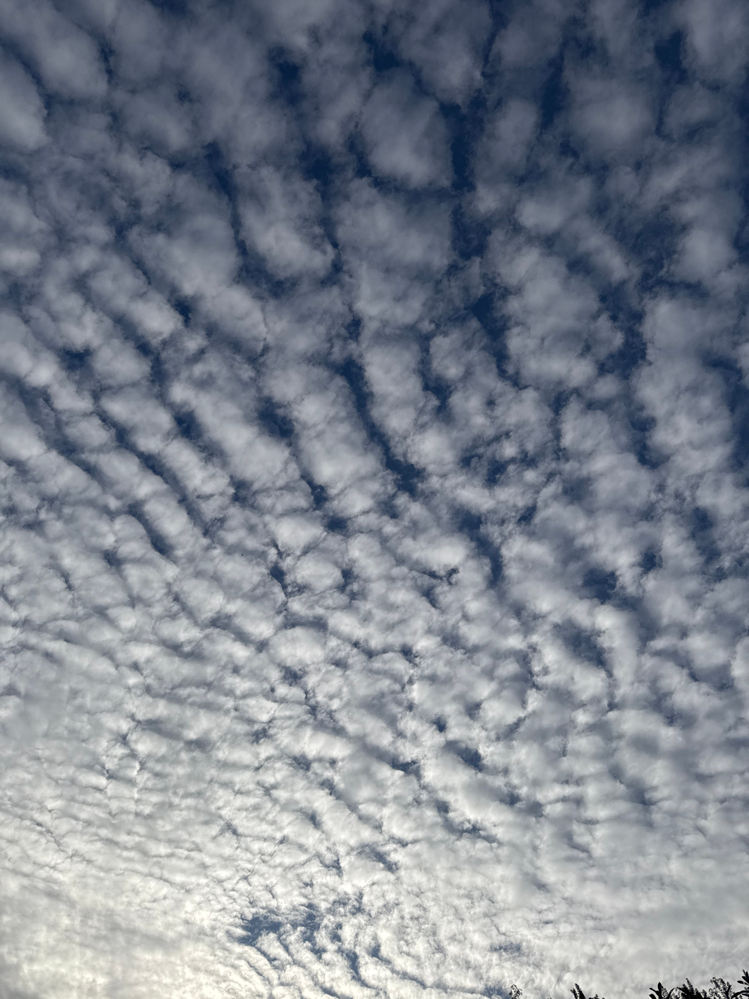 The image shows a sky filled with altocumulus clouds. The clouds are small, puffy, and arranged in rows or sheets, giving the sky a rippled or textured appearance. Patches of blue sky are visible betw…read more
