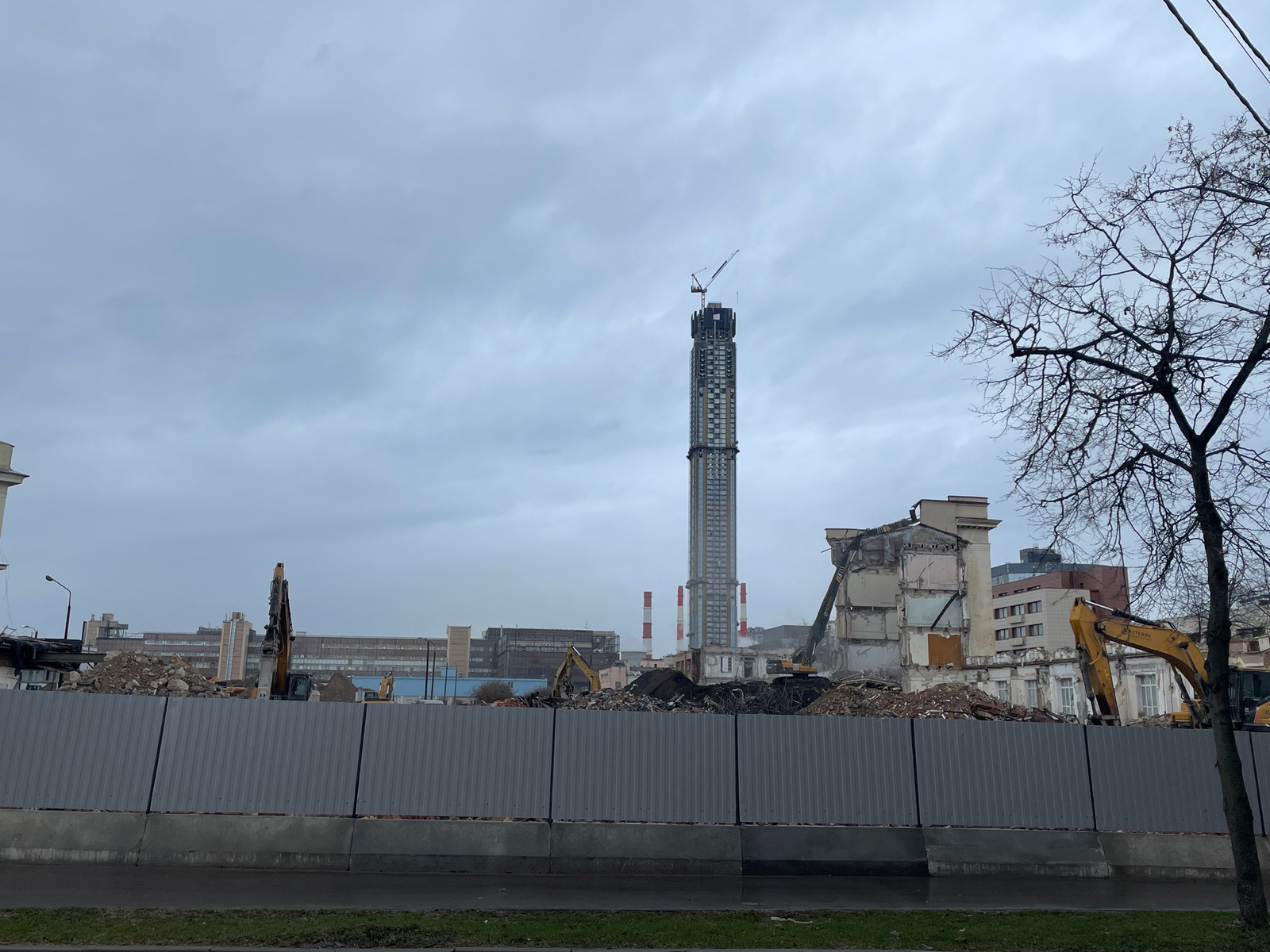 The image depicts an urban demolition site in Moscow, Russia. A grey corrugated metal fence runs along the foreground, separating the viewer from the construction zone. Behind the fence, there is rubb…read more