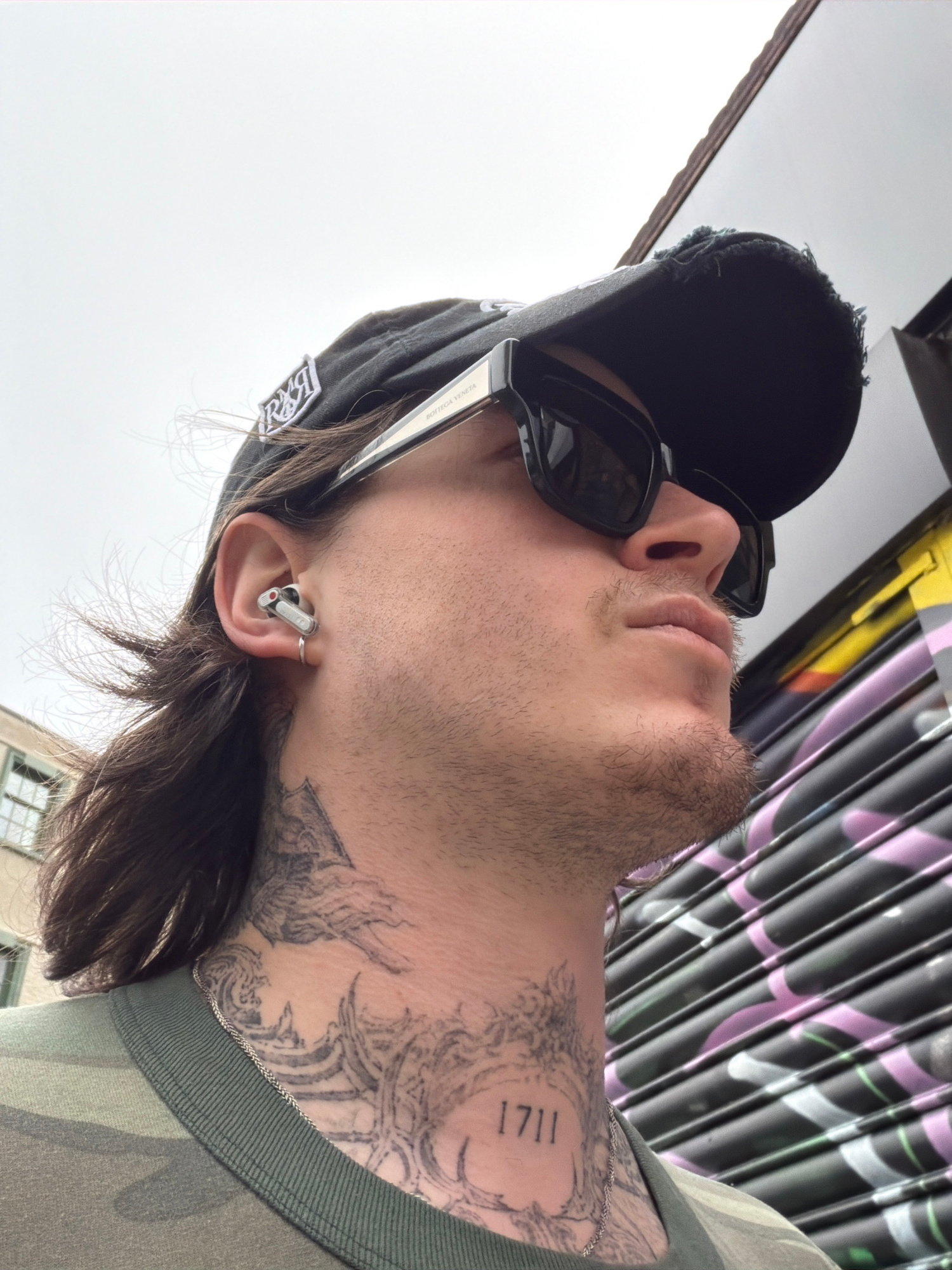 A man with a black baseball cap and sunglasses is photographed from a low angle. He is wearing a camouflage shirt and has tattoos on his neck. The man has an earbud in his ear. He is positioned in fro…read more