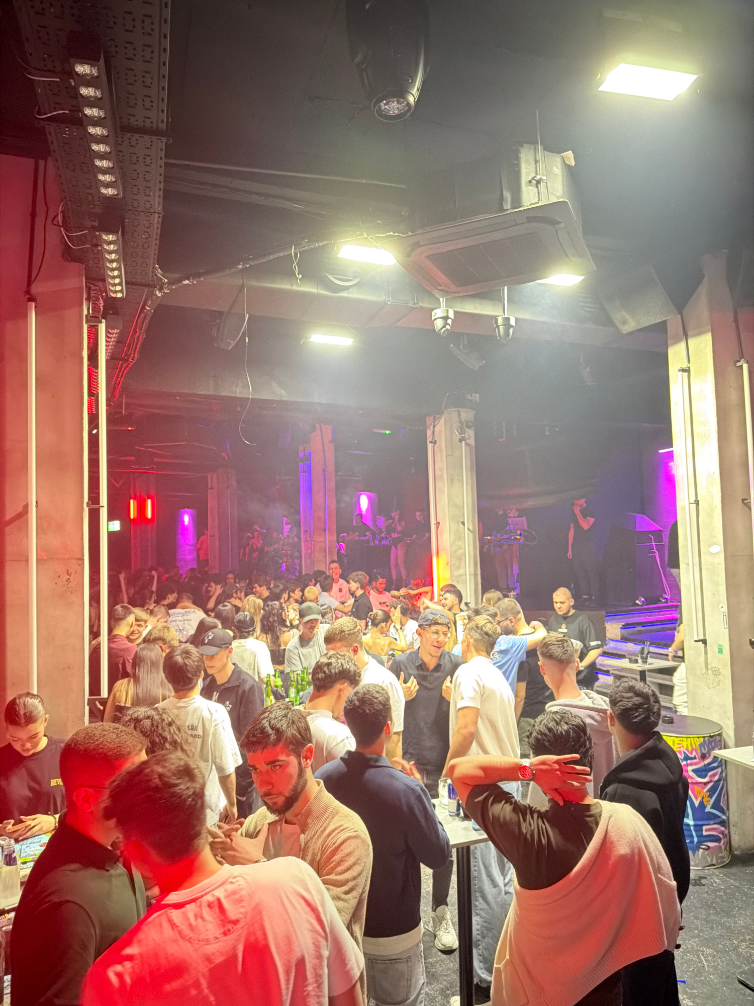 The image depicts a crowded indoor scene, likely a nightclub or music venue, in Varna, Bulgaria. A dense gathering of people, mostly young adults, is observed. The lighting is a mix of bright white sp…read more
