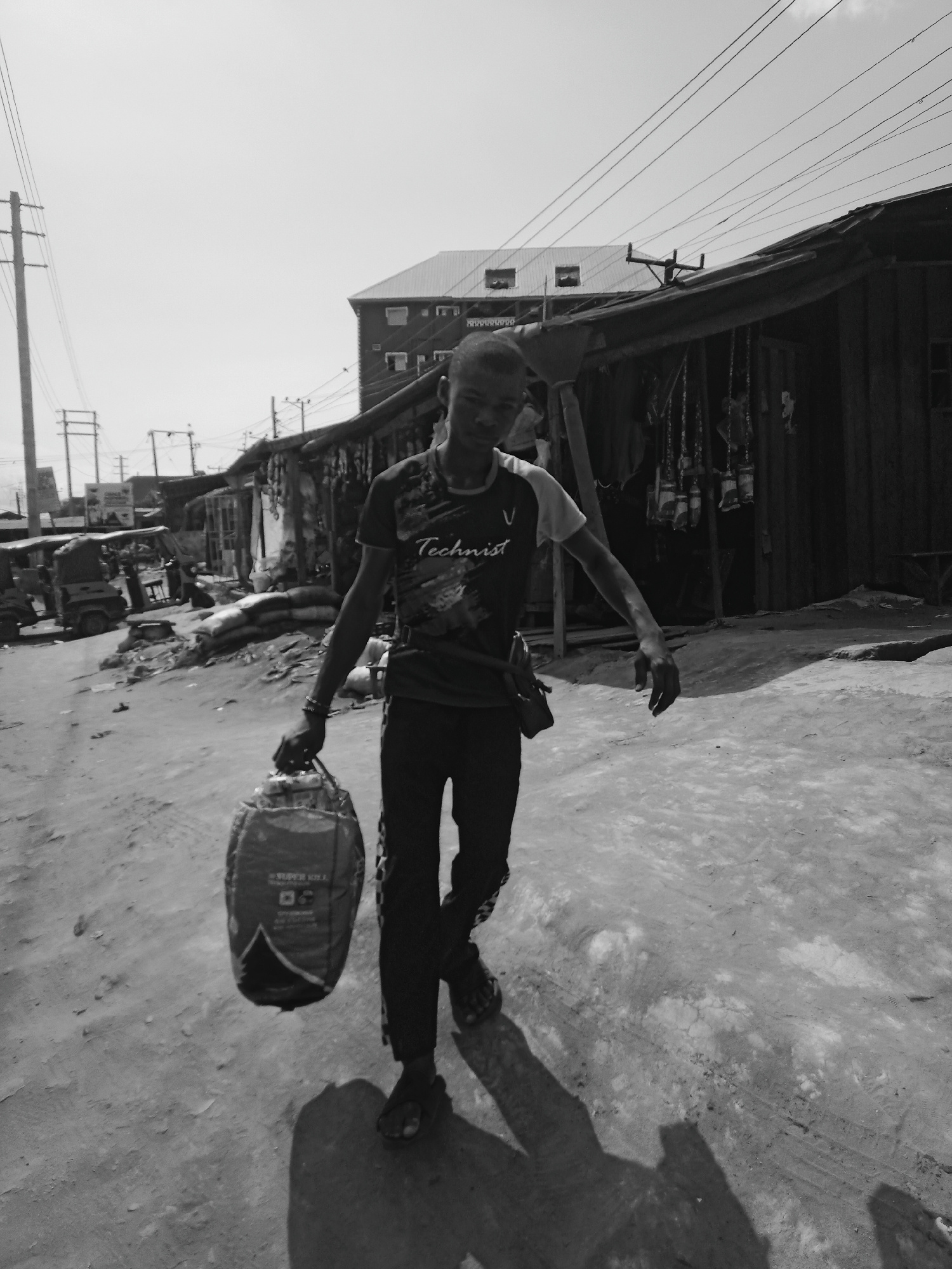 A black and white photograph captures a young man walking along a dusty, unpaved street in Onitsha, Nigeria, under a bright, clear sky. The man, positioned centrally and walking towards the viewer, we…read more