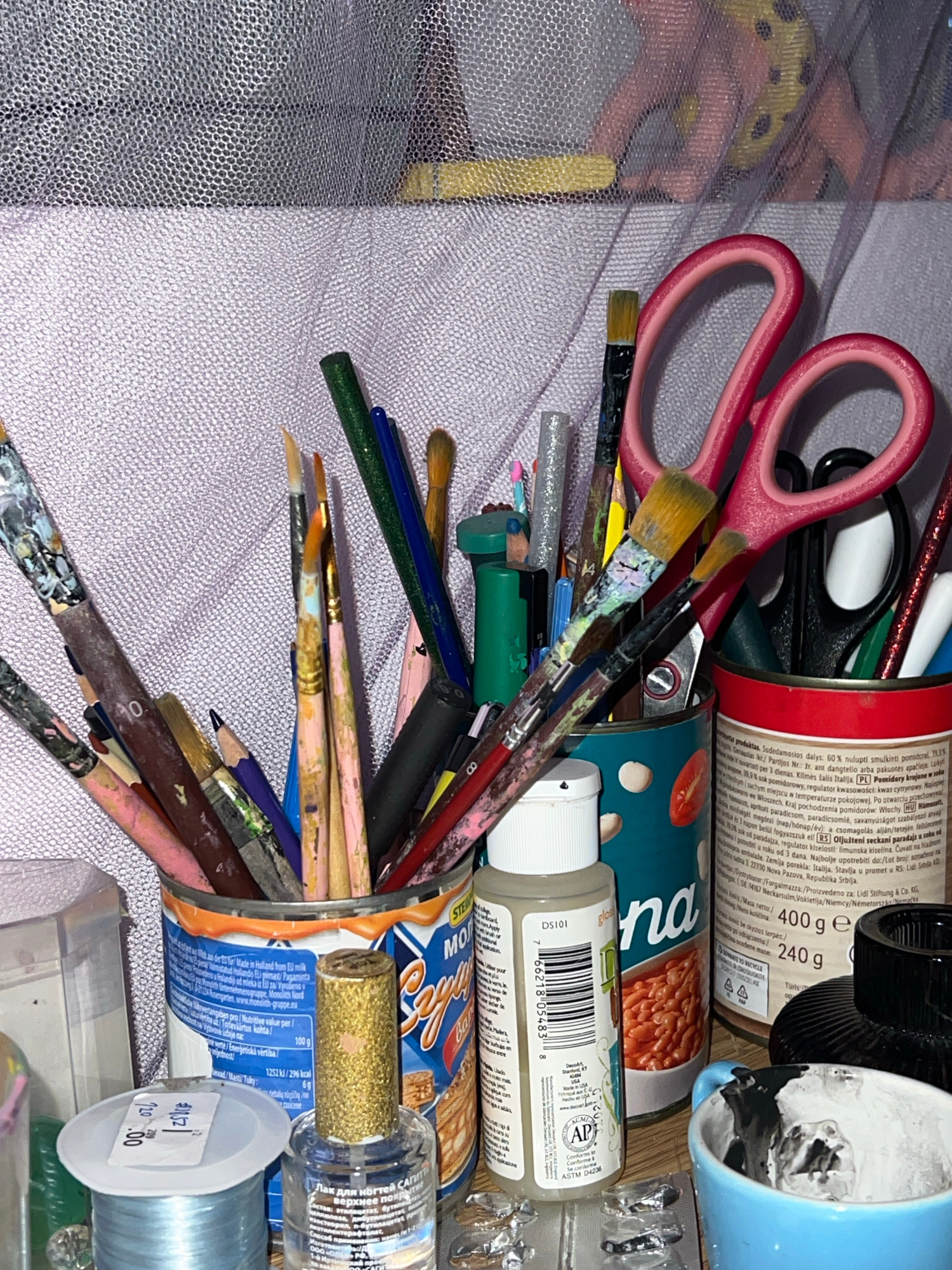 The image presents a chaotic arrangement of art and craft supplies. Various paintbrushes, pencils, and scissors are jumbled together with opened cans used as containers. One can is labeled as choppedβ¦read more