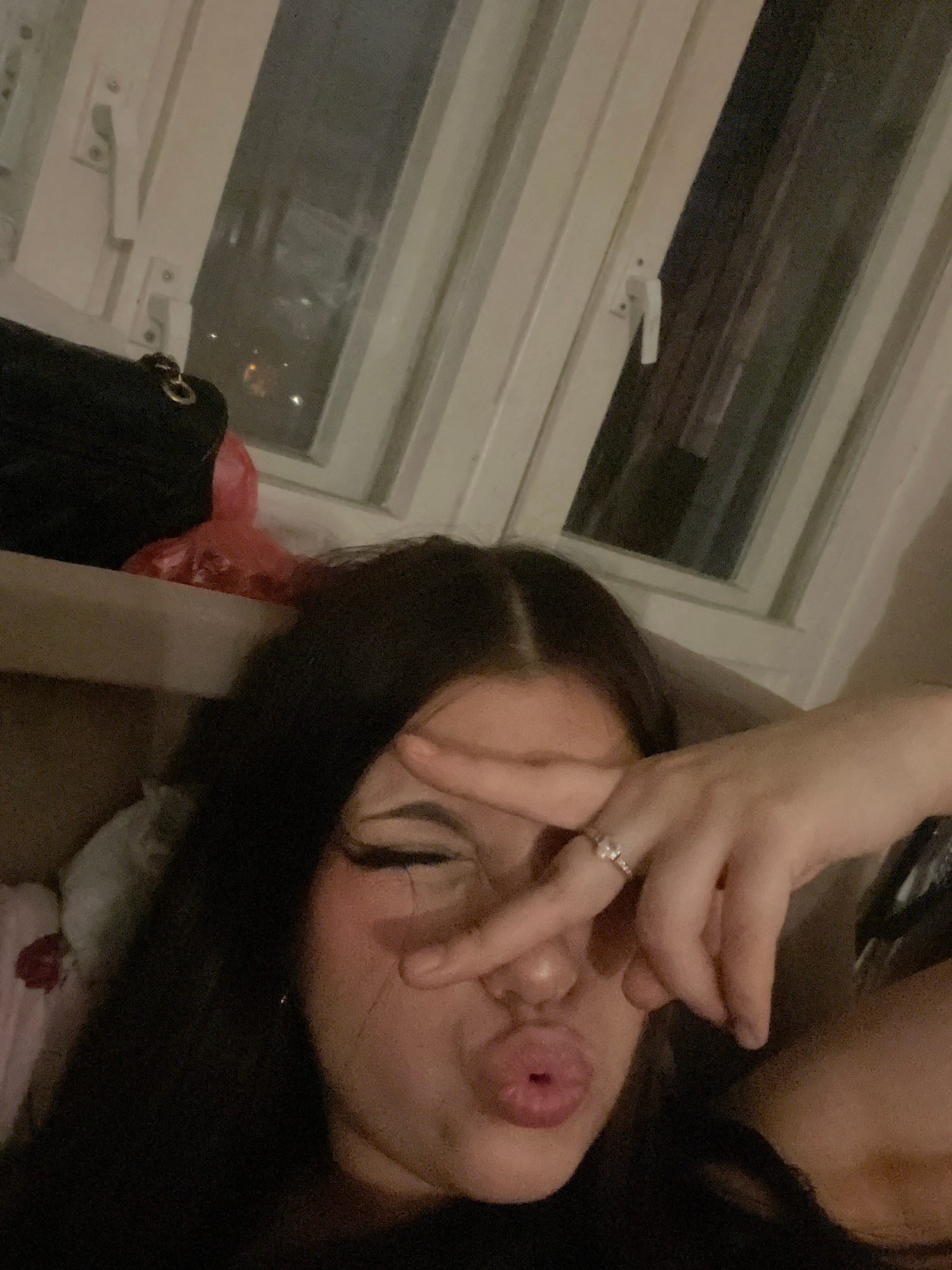 A woman with long, dark hair is positioned in the foreground, her face close to the camera. She is making a pouting expression and holding her fingers in a "V" shape near her eye. On her finger, a rin…read more