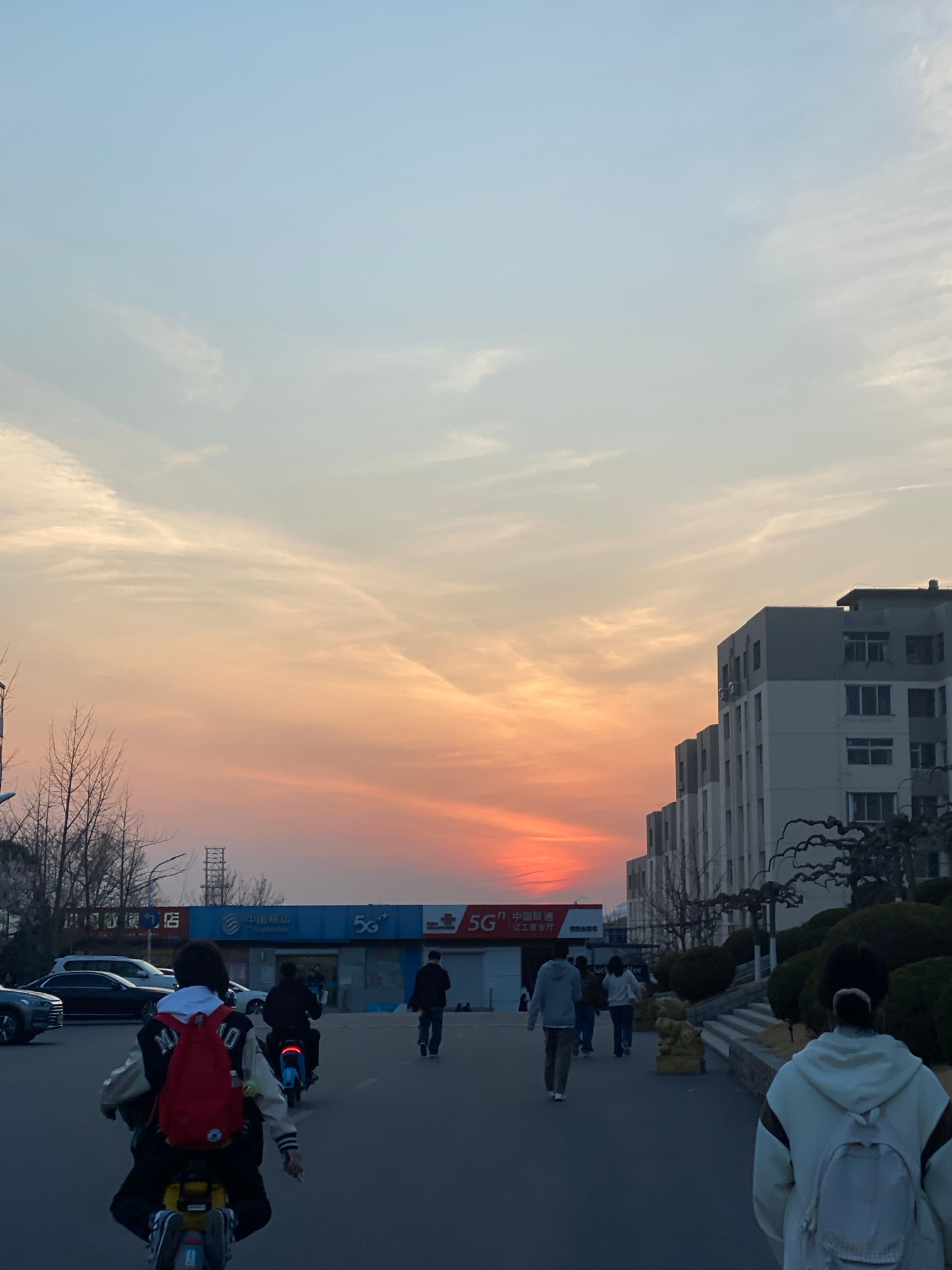 A street scene at sunset features a building, a 5G China Mobile advertisement, and traffic. People are walking on the sidewalk, while others are riding electric bikes in the street. Bare trees are vis…read more