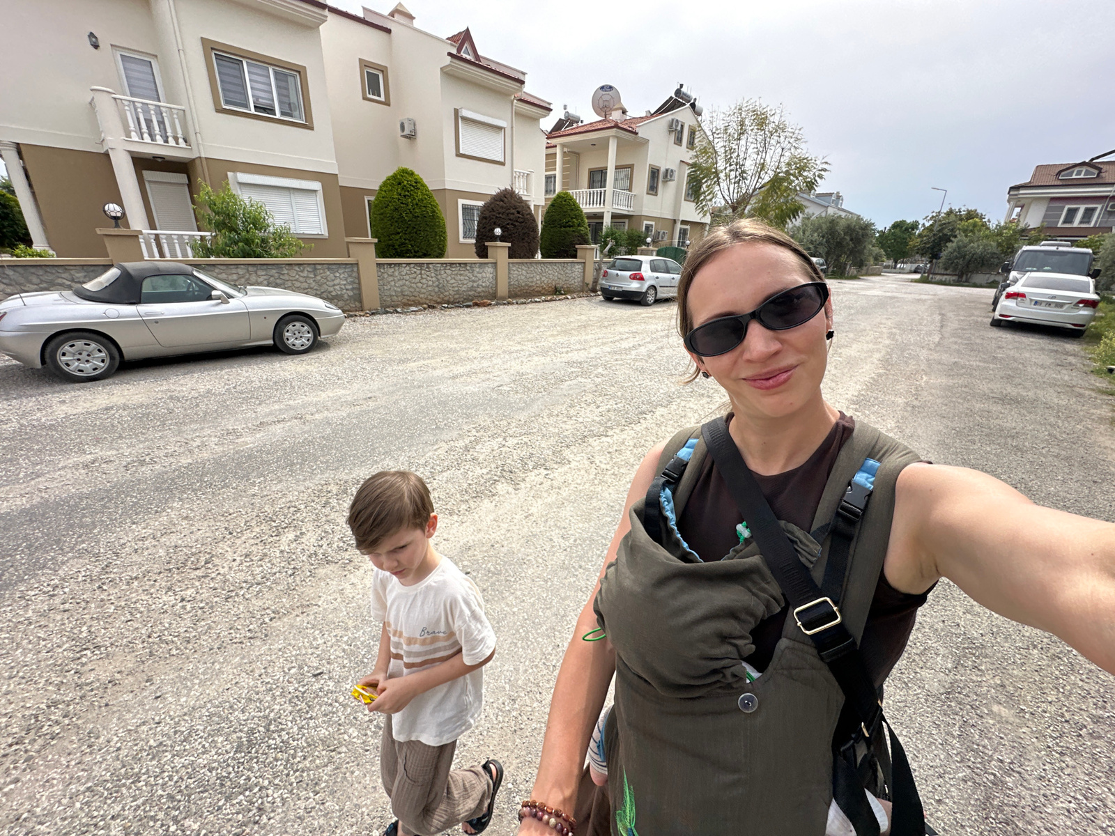 A street scene captures a woman holding a smartphone, posing for a selfie with a young boy walking beside her. The woman wears sunglasses and carries a baby in a green front carrier with black straps.…read more