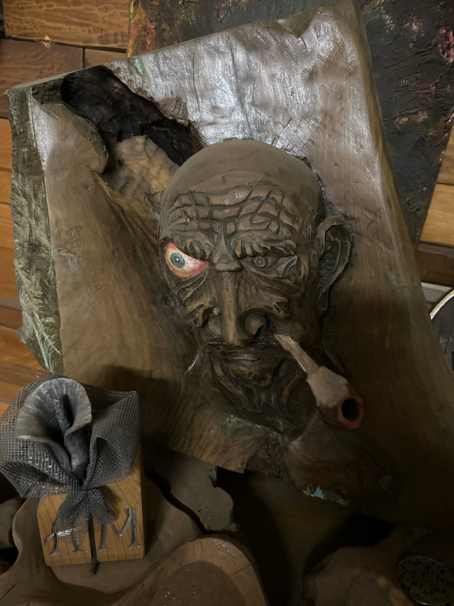 This image captures a close-up, slightly overhead view of a rustic wooden relief carving, depicting the weathered face of an old man, set into a larger piece of wood. The carving is oriented diagonall…read more