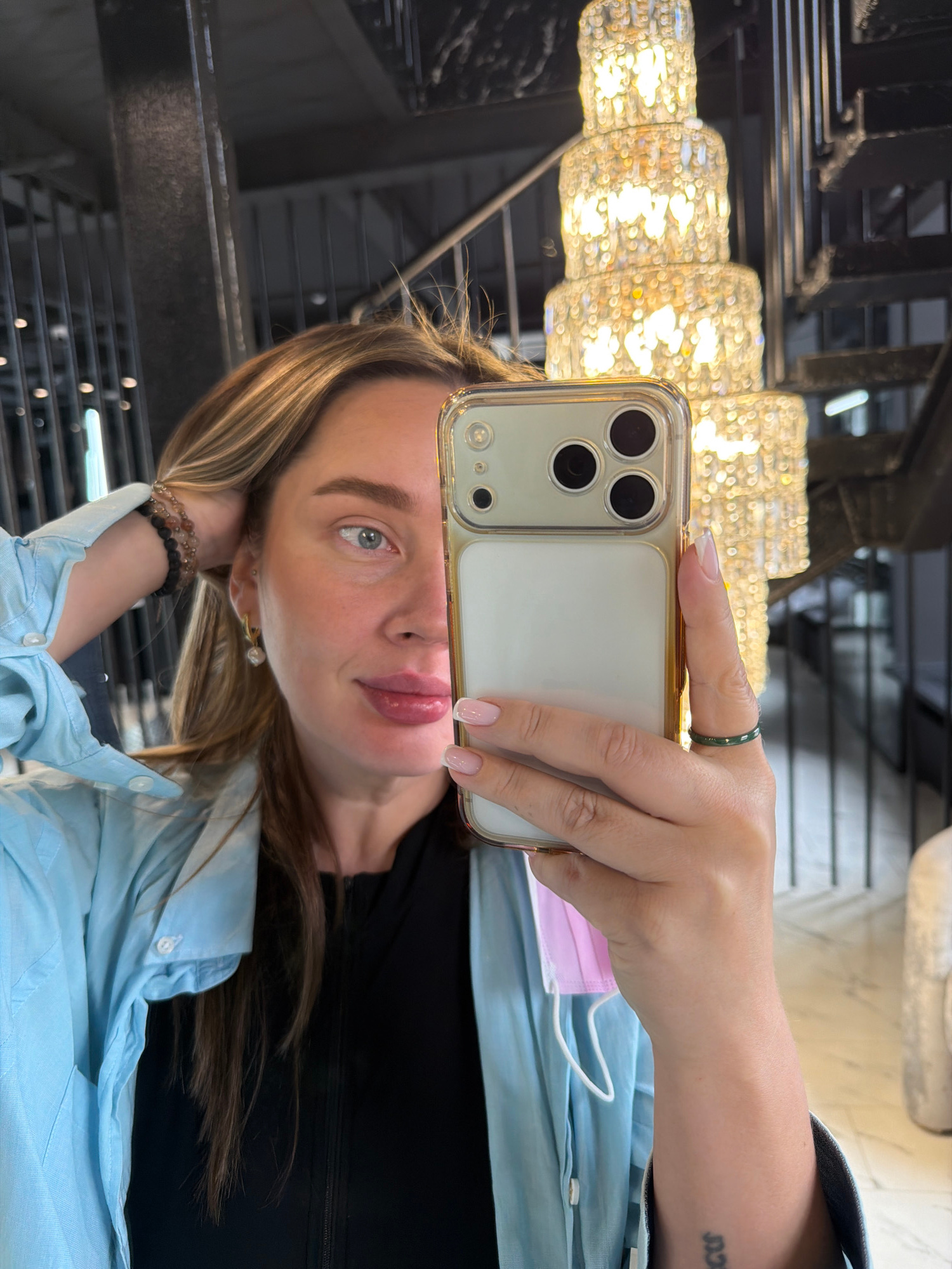 A woman is taking a selfie in front of a chandelier. The woman has light hair with highlights and light eyes. She is wearing a light blue shirt and a black top. She is holding a gold iPhone with a cle…read more