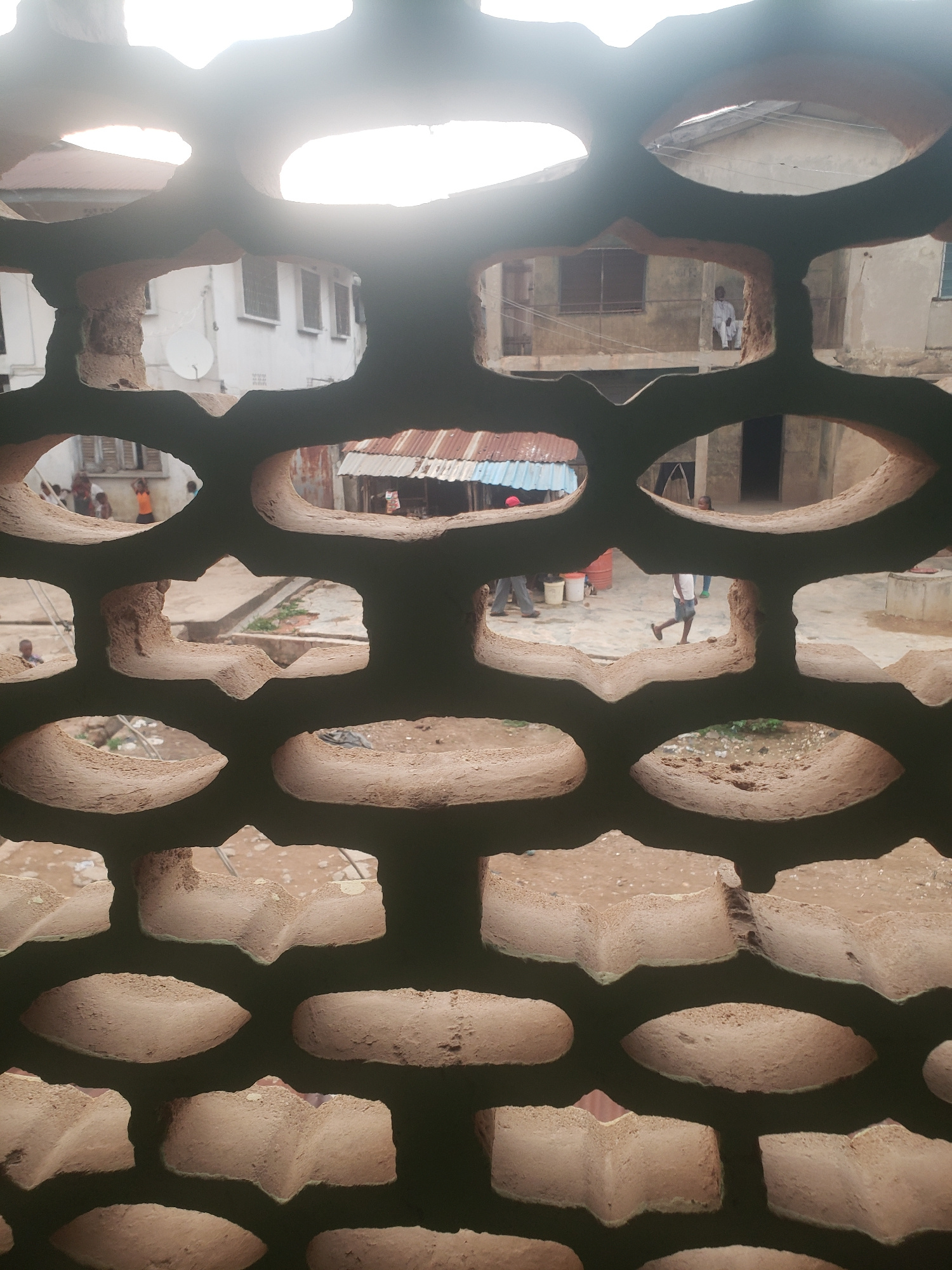The image depicts a perforated wall, likely made of a porous, earthen material, providing a blurred and fragmented view of the surrounding urban environment in Alalubosa, Nigeria. The wall is composed…read more