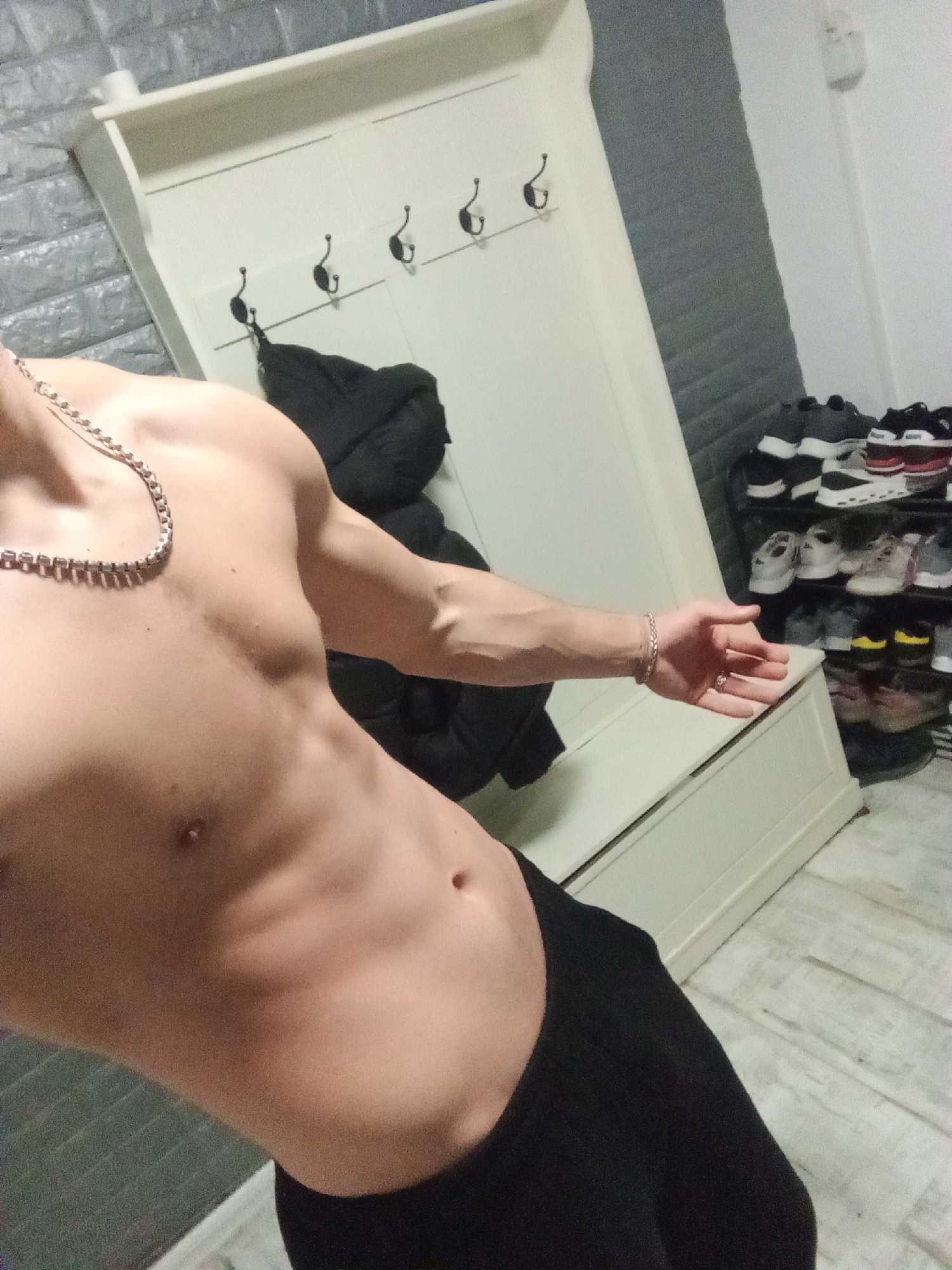 A shirtless person with a silver chain necklace and bracelet stands in front of a white coat rack with hanging hooks. A black coat is hanging on one of the hooks. To the right of the coat rack is a sh…read more